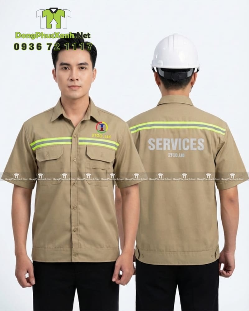 Áo bảo hộ kỹ sư xây thiết kế tay ngắn thoải mái vận động kết hợp dải phản quang xanh lá nổi bật ở ngực, vai và lưng, giúp tăng khả năng nhận diện ban đêm hoặc khu vực thiếu sáng. Phần logo công ty được thêu sắc nét phía ngực và chữ “SERVICES” lớn kèm phản quang ở lưng.