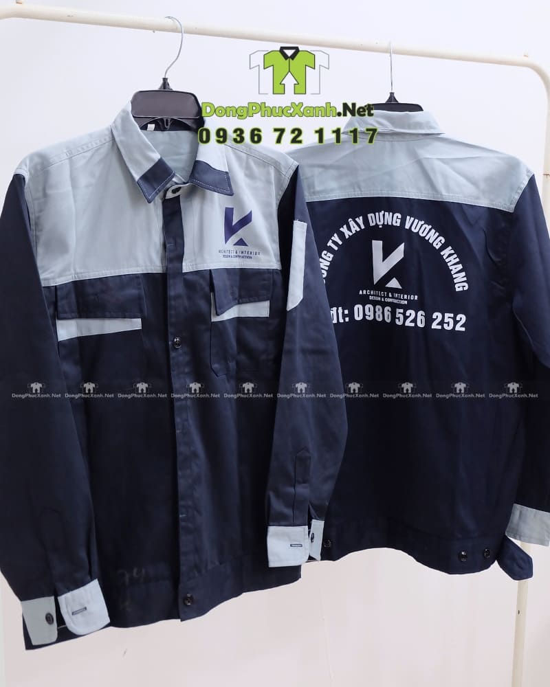 Áo bảo hộ kỹ sư xây dựng vải kaki được thiết kế với kiểu dáng khỏe khoắn, form đứng gọn gàng, phù hợp cho môi trường công trình và thi công ngoài trời. Áo sử dụng tông màu xanh đậm phối xám nhạt hiện đại, tạo cảm giác chuyên nghiệp và dễ nhận diện. Chất liệu vải dày dặn, bền bỉ, giúp bảo vệ người mặc khi làm việc. Thiết kế cổ bẻ, cài nút chắc chắn, có túi ngực tiện dụng. Logo và thông tin công ty được in rõ nét ở cả mặt trước và mặt sau.