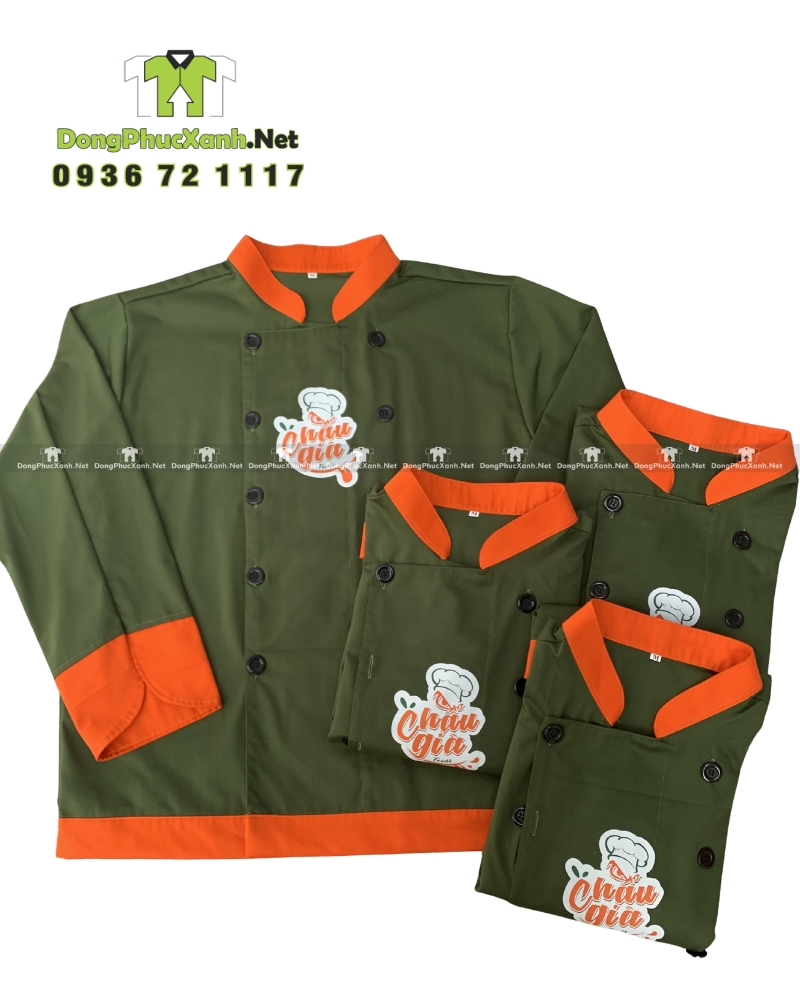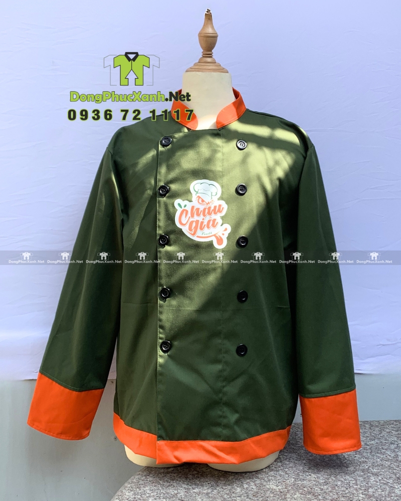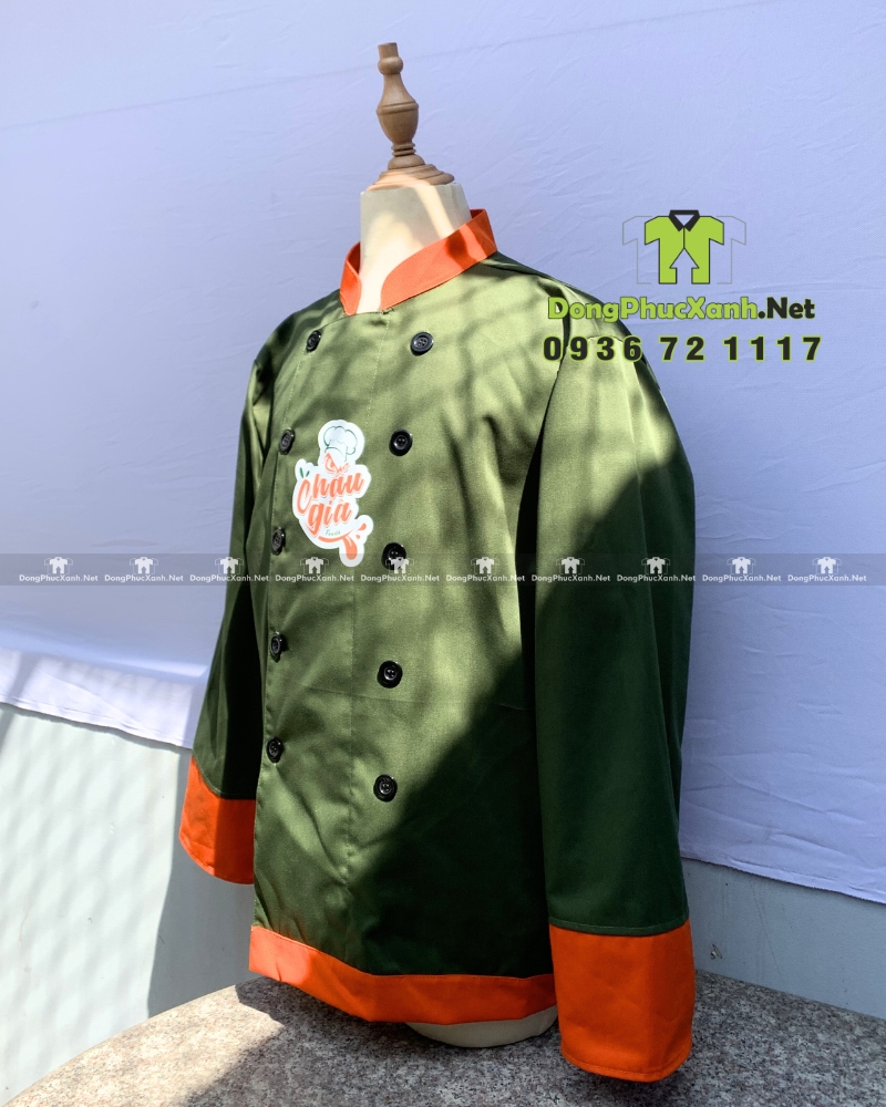 Mẫu áo sử dụng nền xanh rêu làm chủ đạo, kết hợp các chi tiết màu cam ở cổ, tay và lai áo. Cách phối này tạo độ tương phản rõ ràng nhưng vẫn giữ được cảm giác sạch và chắc chắn của trang phục bếp. Màu sắc giúp áo nổi bật khi đứng bếp, đặc biệt trong các khu vực bếp mở hoặc không gian cần hình ảnh chuyên nghiệp.