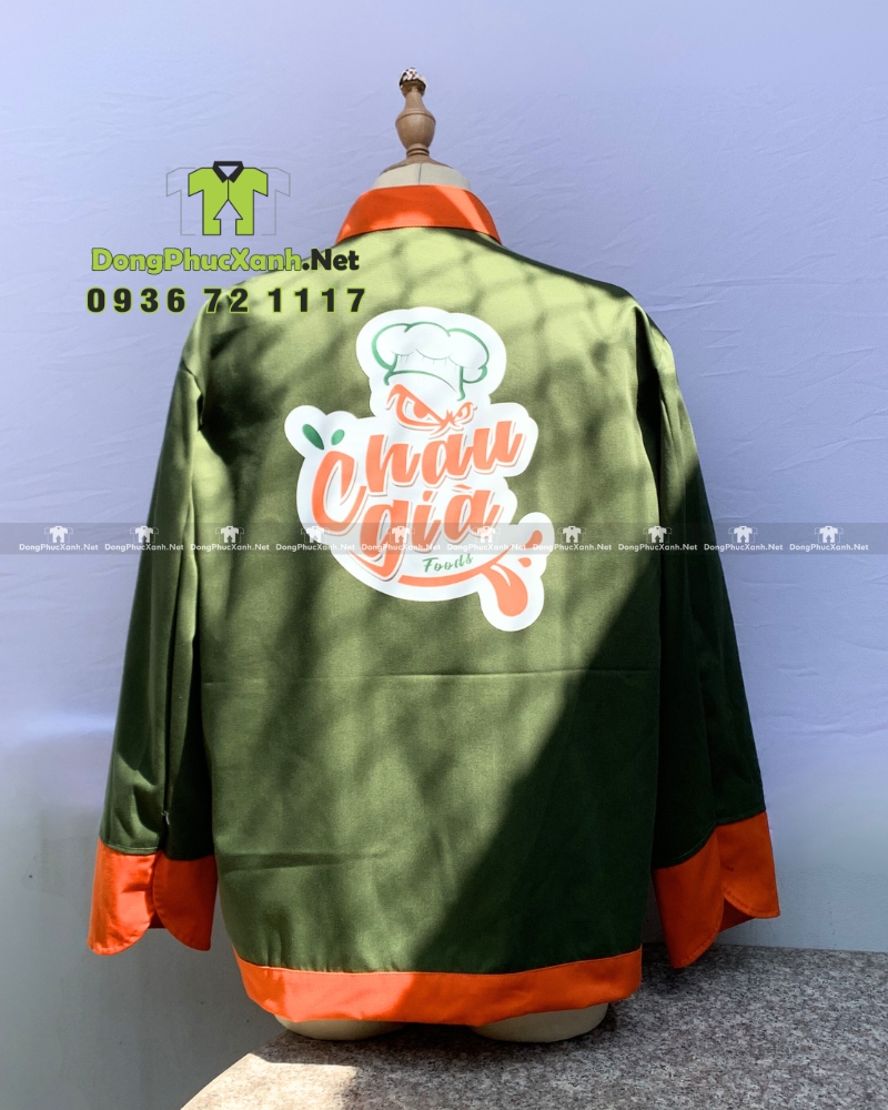 Nền logo sáng giúp nổi bật trên nền vải xanh rêu, đảm bảo nhìn rõ trong điều kiện ánh sáng bếp. Phía sau lưng áo in logo kích thước lớn hơn, giúp tăng khả năng nhận diện thương hiệu với khách hàng.
