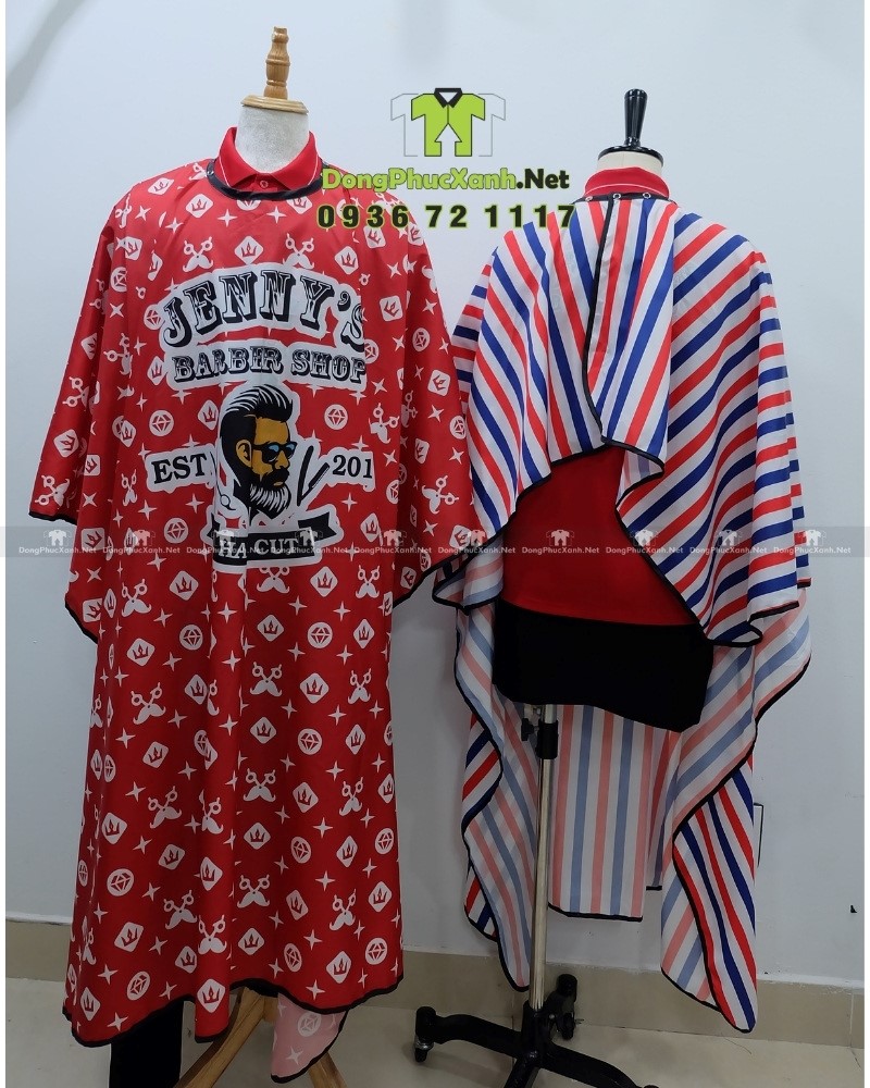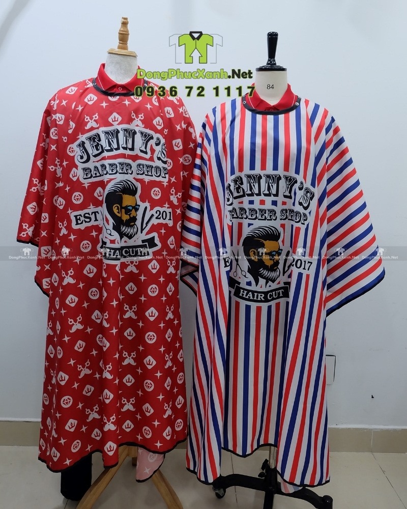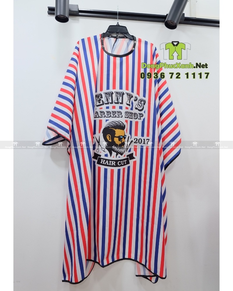 Áo choàng tóc đồng phục in logo là lựa chọn hàng đầu cho các salon và barber shop muốn thể hiện sự chuyên nghiệp. Thiết kế hiện đại với họa tiết sọc xanh – đỏ nổi bật được in chuyển nhiệt rõ nét, giúp tăng nhận diện thương hiệu và tạo phong cách riêng cho tiệm.