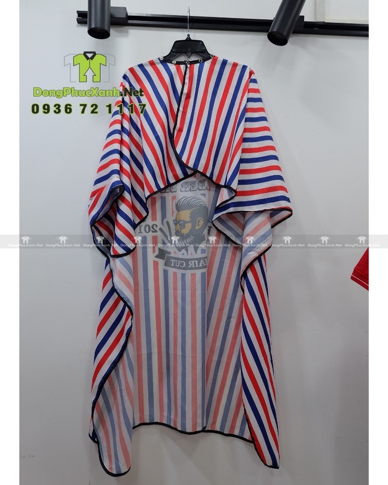Áo Choàng Cắt Tóc In Chuyển Nhiệt Hoạ Tiết Sọc Xanh – Đỏ Kèm Logo In Lớn Nổi Bật