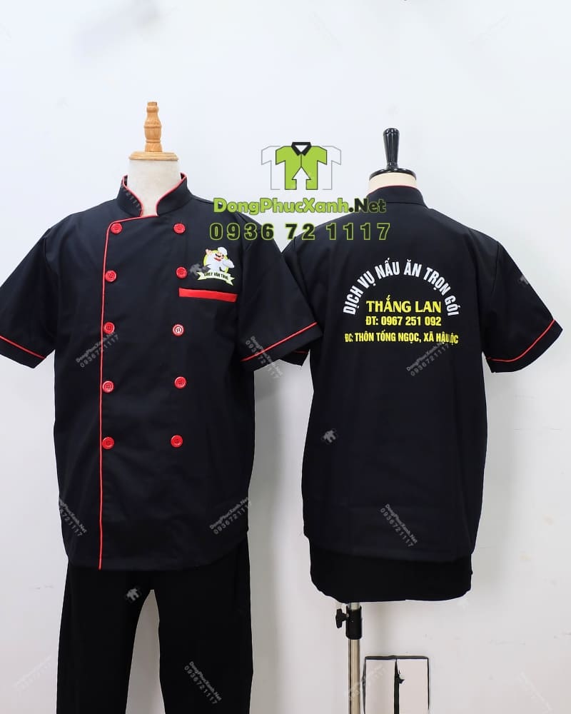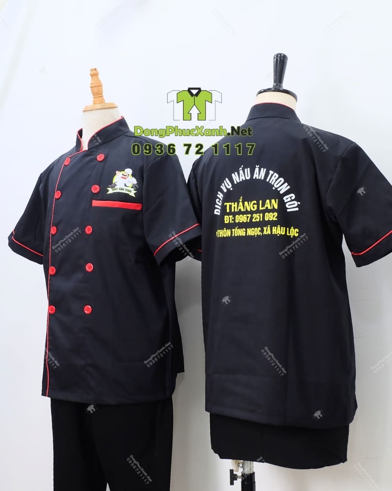 Áo bếp Dịch Vụ Nấu Ăn Trọn Gói Thắng Lan được may theo kiểu áo bếp truyền thống hai hàng cúc, kiểu dáng quen thuộc trong nghề bếp. Cổ đứng cao giúp che phần cổ khỏi hơi nóng từ bếp, trong khi tay ngắn tạo sự linh hoạt khi làm việc. Toàn thân áo màu đen phối viền đỏ nổi bật dọc theo mép cổ, nẹp cúc và túi ngực, mang đến điểm nhấn màu sắc giúp áo trông có chiều sâu hơn so với mẫu trơn thông thường.