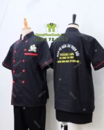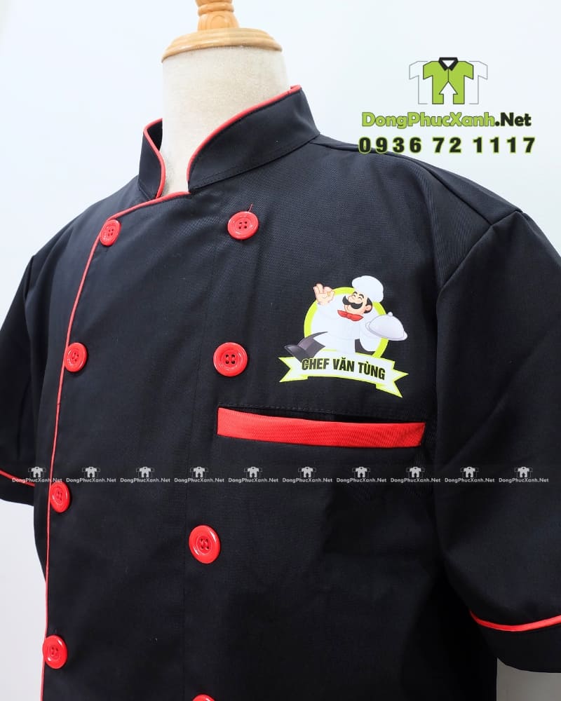 Mẫu áo bếp Thắng Lan có nền áo đen phối viền và cúc đỏ tạo được sự nổi bật nhất định phù hợp với phong cách nấu ăn chuyên nghiệp trong không gian bếp.