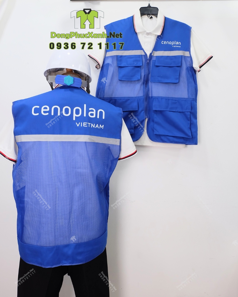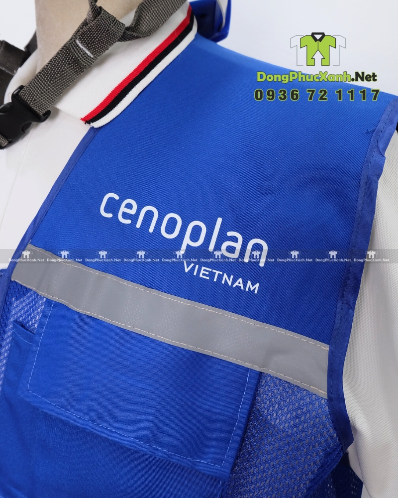 Mặt trước in tên cenoplan Vietnam ở vị trí ngực giúp nhận diện khi giao tiếp trực diện, đồng thời giữ bố cục gọn gàng trên nền áo xanh. Mặt sau in logo kích thước lớn ở phần bả vai kết hợp mảng lưới lớn phía dưới giúp vừa tăng nhận diện đội nhóm vừa đảm bảo sự thoáng mát trong quá trình làm việc dài giờ.