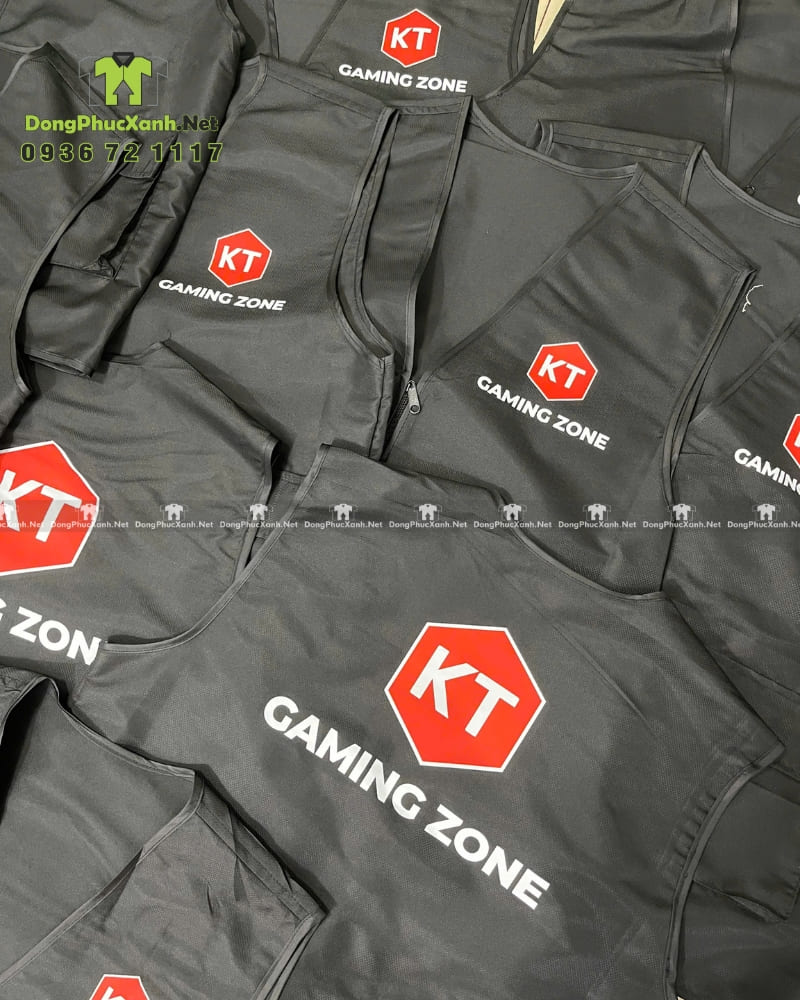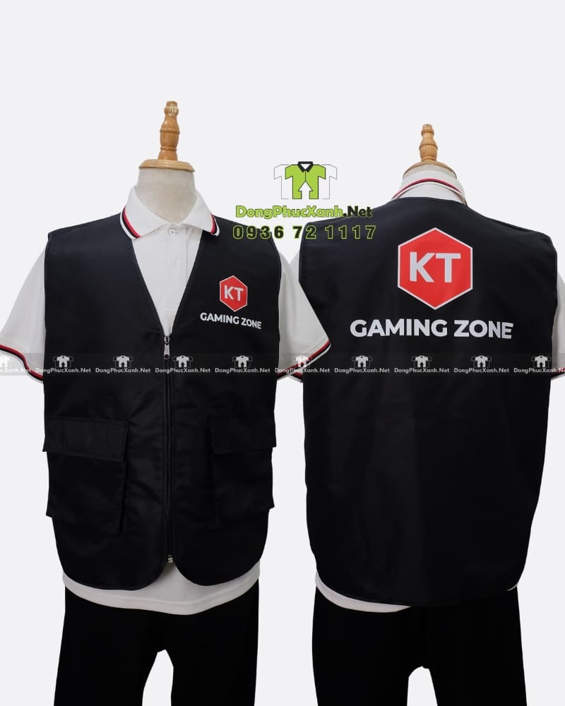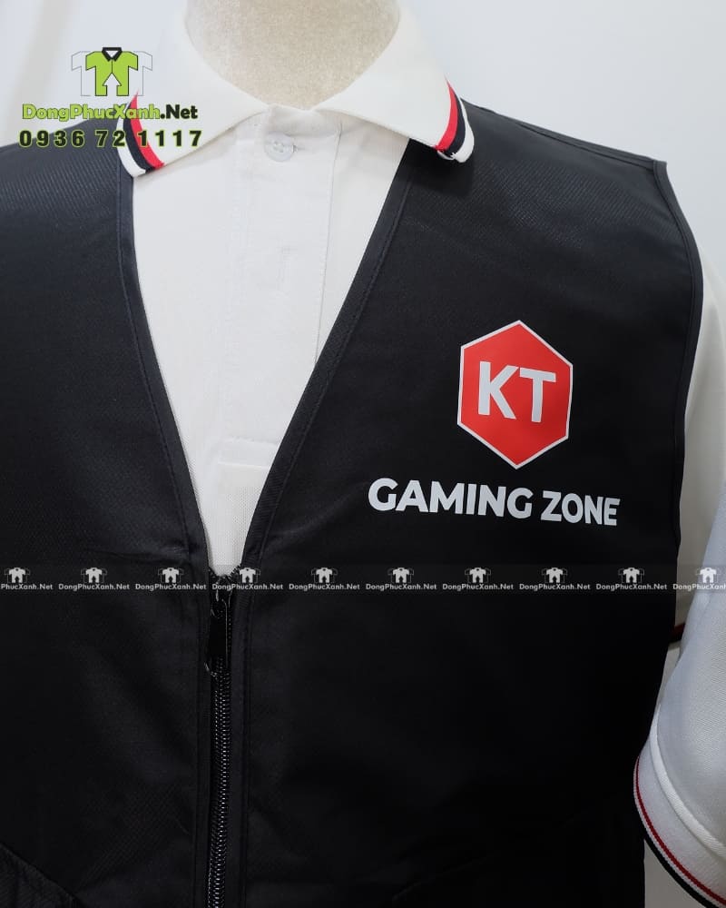 Mẫu áo gile KT Gaming Zone dùng tông đen làm màu nền chủ đạo, đây là màu phổ biến nhất trong đồng phục ngành gaming và giải trí, dễ phối với hầu hết màu áo bên trong.