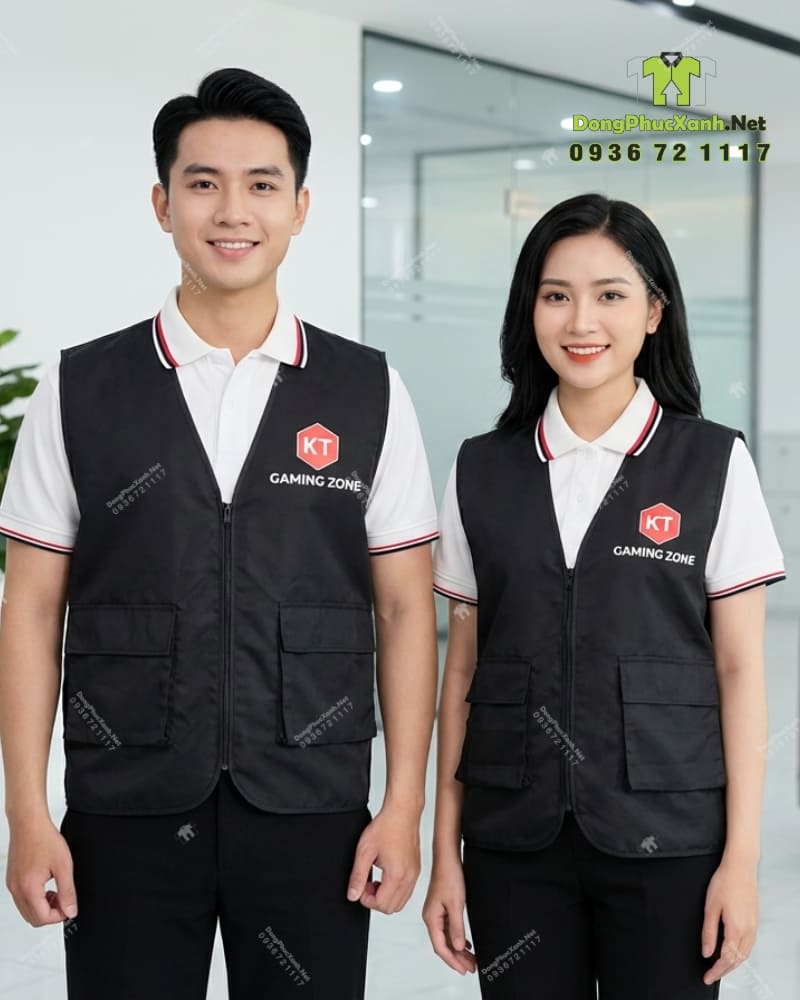 Áo gile đồng phục KT Gaming Zone là mẫu áo không tay cổ chữ V, kéo khóa giữa, thiết kế gọn nhẹ phù hợp mặc ngoài áo thun hoặc áo polo. Đây là kiểu gile được nhiều doanh nghiệp lựa chọn vì dễ mặc, dễ tháo ra trong ca làm việc và tạo được sự đồng bộ rõ ràng cho toàn đội ngũ mà không cần thay toàn bộ trang phục.