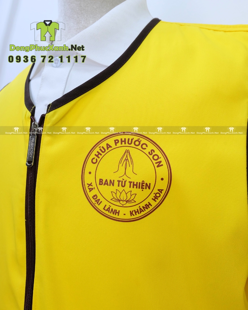 - In ấn mặt trước: Ngực trái áo được in logo tròn của “Ban Từ Thiện Chùa Phước Sơn – Xã Đại Lãnh – Khánh Hòa” với màu nâu đỏ truyền thống, sắc nét và dễ nhận diện.