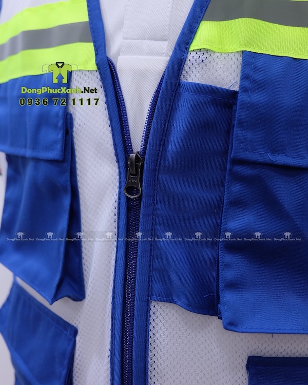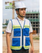 Tông xanh – trắng phối phản quang mang lại vẻ chuyên nghiệp, dễ nhận biết ở khu vực thi công. Logo có thể in theo yêu cầu để đồng bộ nhận diện doanh nghiệp.