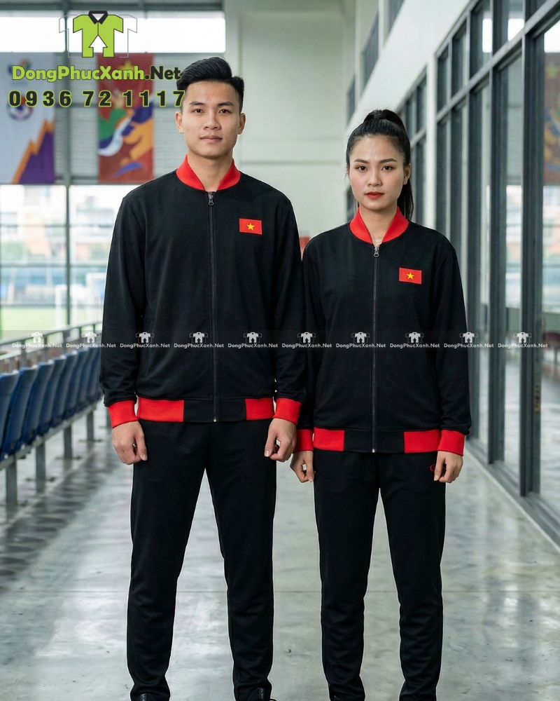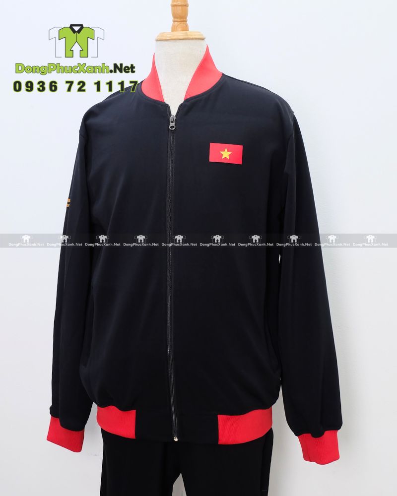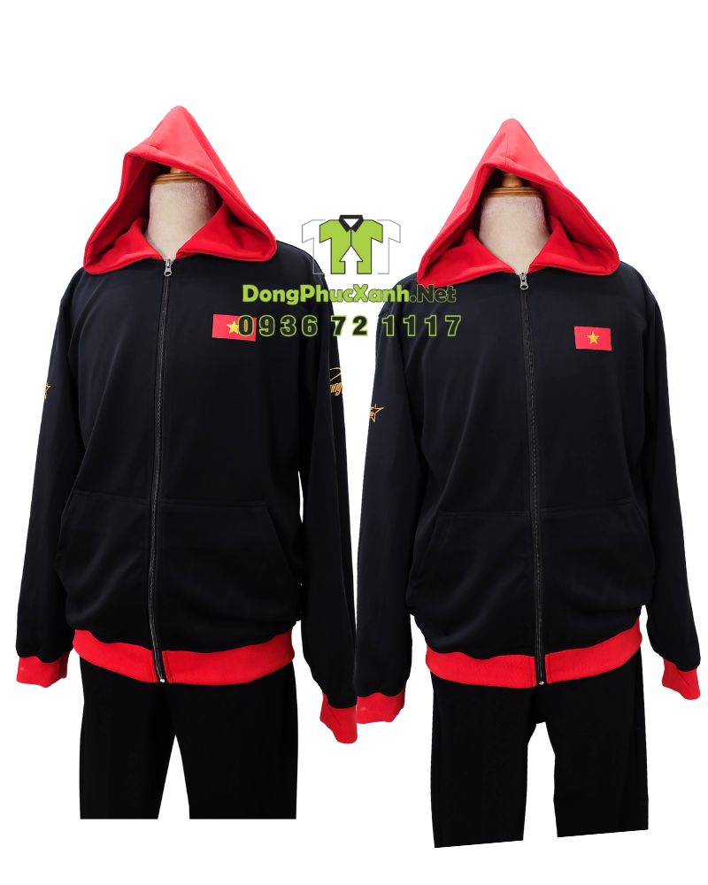 Tổng thể áo sử dụng tông đen làm nền chính để tạo cảm giác sạch và dễ phối, kết hợp điểm nhấn màu đỏ ở phần mũ, bo tay và bo gấu để tăng độ nổi bật khi đứng theo đội hình hoặc xuất hiện trong không gian đông người. Trên ngực áo có thêu cờ Việt Nam đặt phía trước, tạo điểm nhấn rõ ràng.