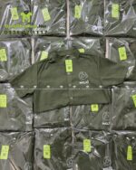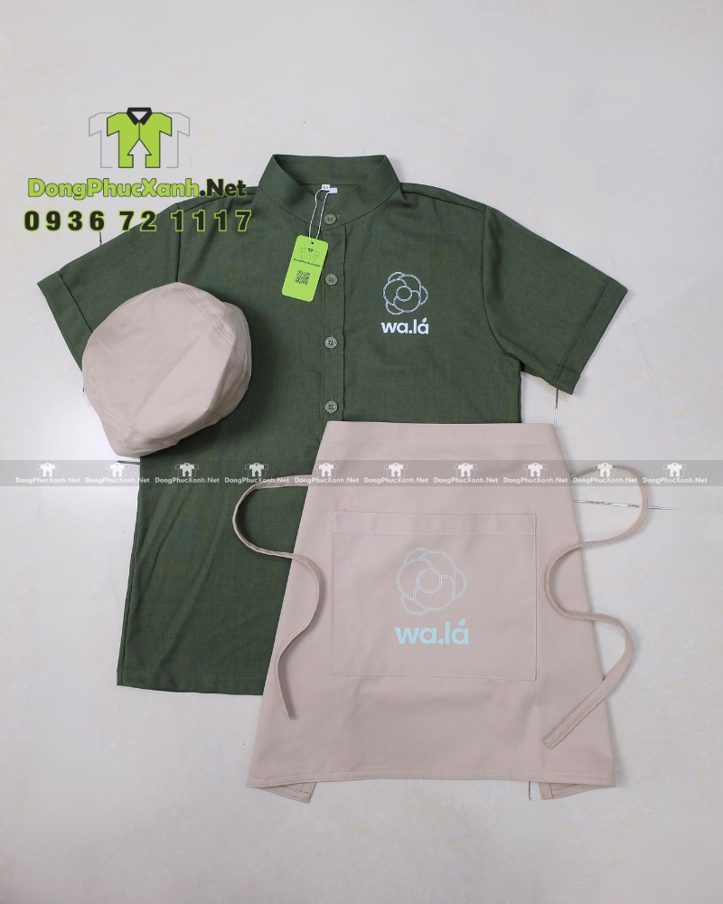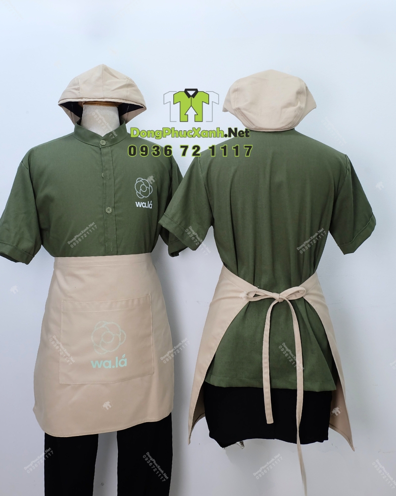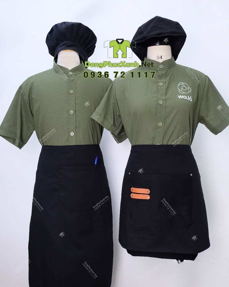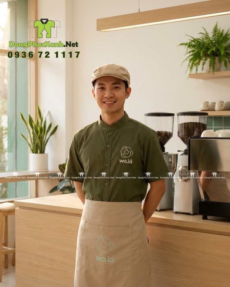 Mẫu áo sơ mi đồng phục có màu xanh rêu, đây là tông màu dễ ứng dụng trong ngành F&B vì tạo cảm giác sạch sẽ, thân thiện và có chiều sâu khi lên hình. Khi phối cùng tạp dề đen hoặc tạp dề be, bộ đồng phục vừa nổi bật nhận diện vừa cân đối thị giác, phù hợp cho nhiều phong cách không gian từ tối giản đến hiện đại.