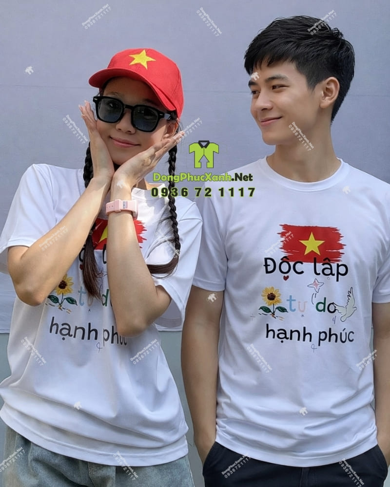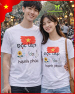 - Màu sắc: Áo có tông nền trắng chủ đạo, đây là gam màu trung tính giúp làm nổi bật hoàn toàn các chi tiết in ấn đa sắc màu (đỏ của cờ, vàng của hoa, và đen của chữ). Sắc trắng cũng mang lại cảm giác trẻ trung, năng động và cực kỳ dễ phối đồ cho các cặp đôi hoặc hội nhóm.