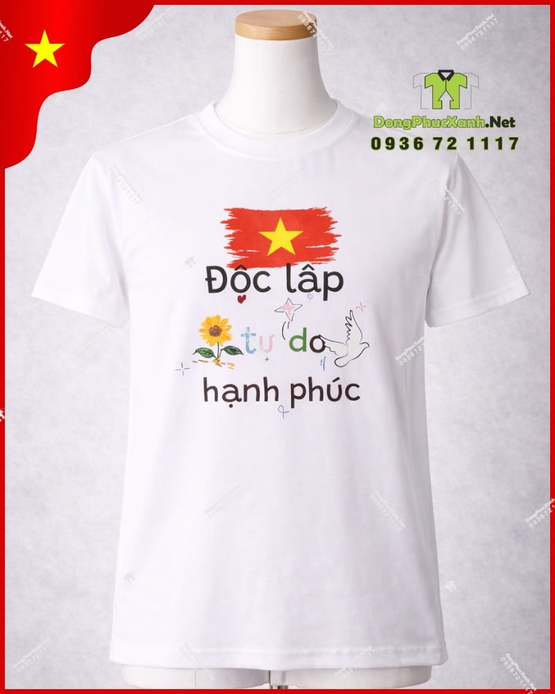 Bố cục hình in bao gồm hình ảnh lá cờ Tổ quốc được cách điệu theo nét vẽ sơn mài mạnh mẽ ở trên cùng. Phía dưới là dòng chữ “Độc lập – Tự do – Hạnh phúc” được trình bày tinh tế với các font chữ khác nhau, kết hợp cùng các biểu tượng phụ trợ như hoa hướng dương vàng rực rỡ và cánh chim bồ câu trắng – biểu tượng của hòa bình. Cách sắp xếp này giúp chiếc áo không chỉ là một trang phục thời trang mà còn truyền tải tinh thần yêu nước và khát vọng bình yên.
