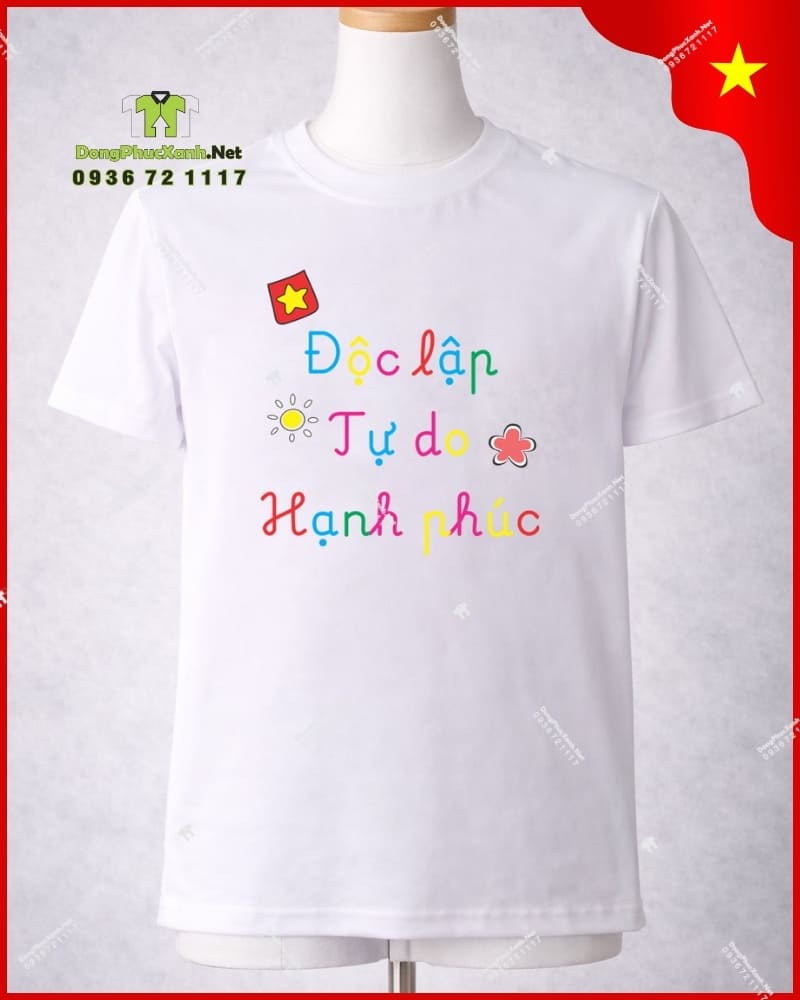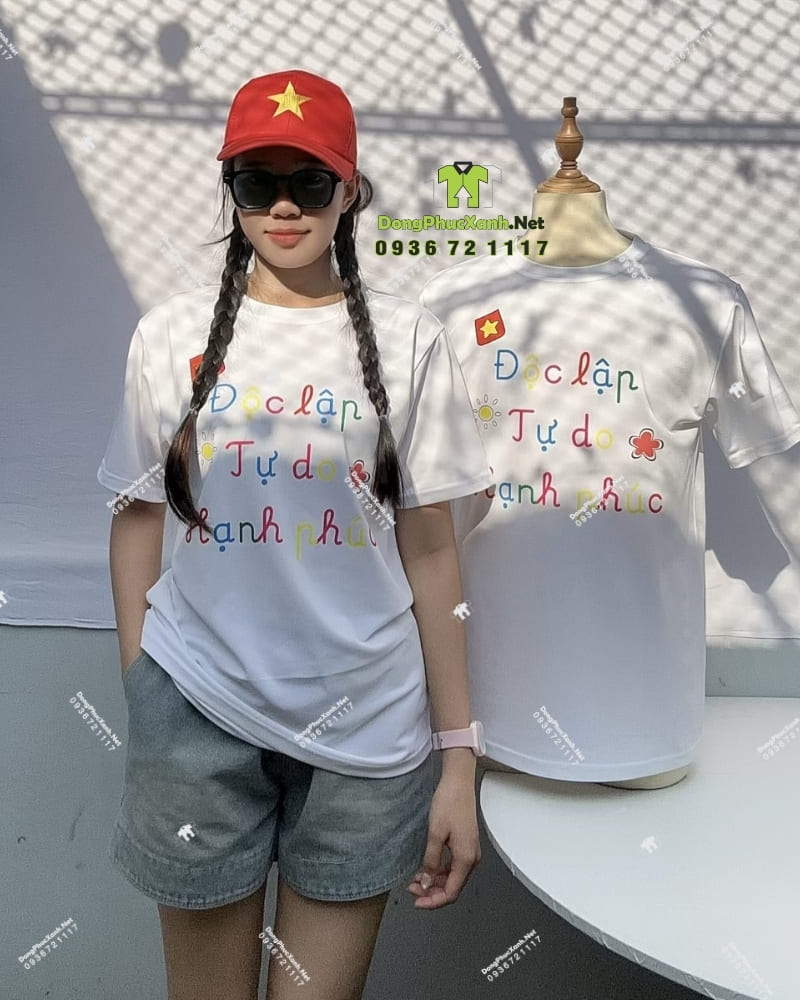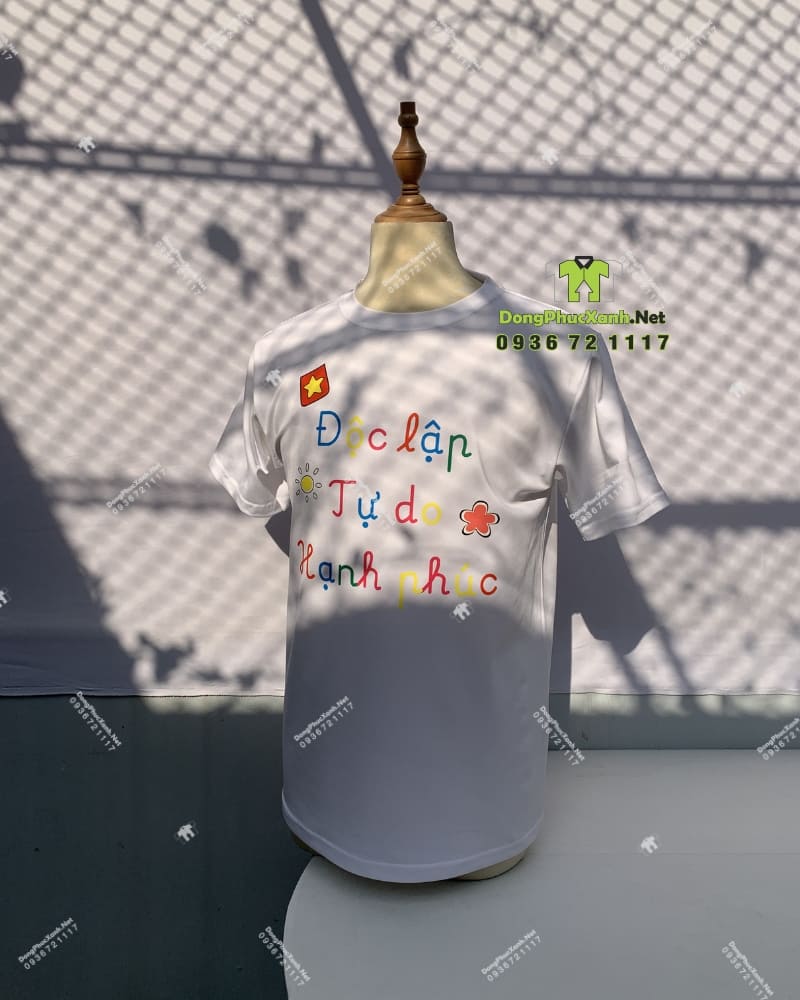 Trên nền áo màu trắng tinh khôi, thông điệp “Độc Lập – Tự Do – Hạnh Phúc” được thể hiện trang trọng bằng nét chữ thư pháp màu đỏ nổi bật. Phía dưới dòng chữ là hình ảnh chim bồ câu trắng đang bay, tượng trưng cho hòa bình và khát vọng, được bao quanh bởi các họa tiết cách điệu màu vàng kim và đỏ. Bố cục hình in cân đối giữa ngực áo, tạo nên tổng thể trang nhã nhưng không kém phần ấn tượng.