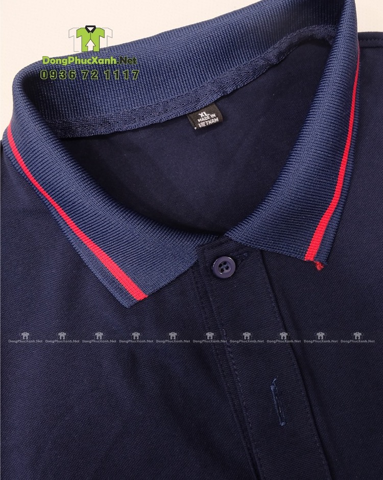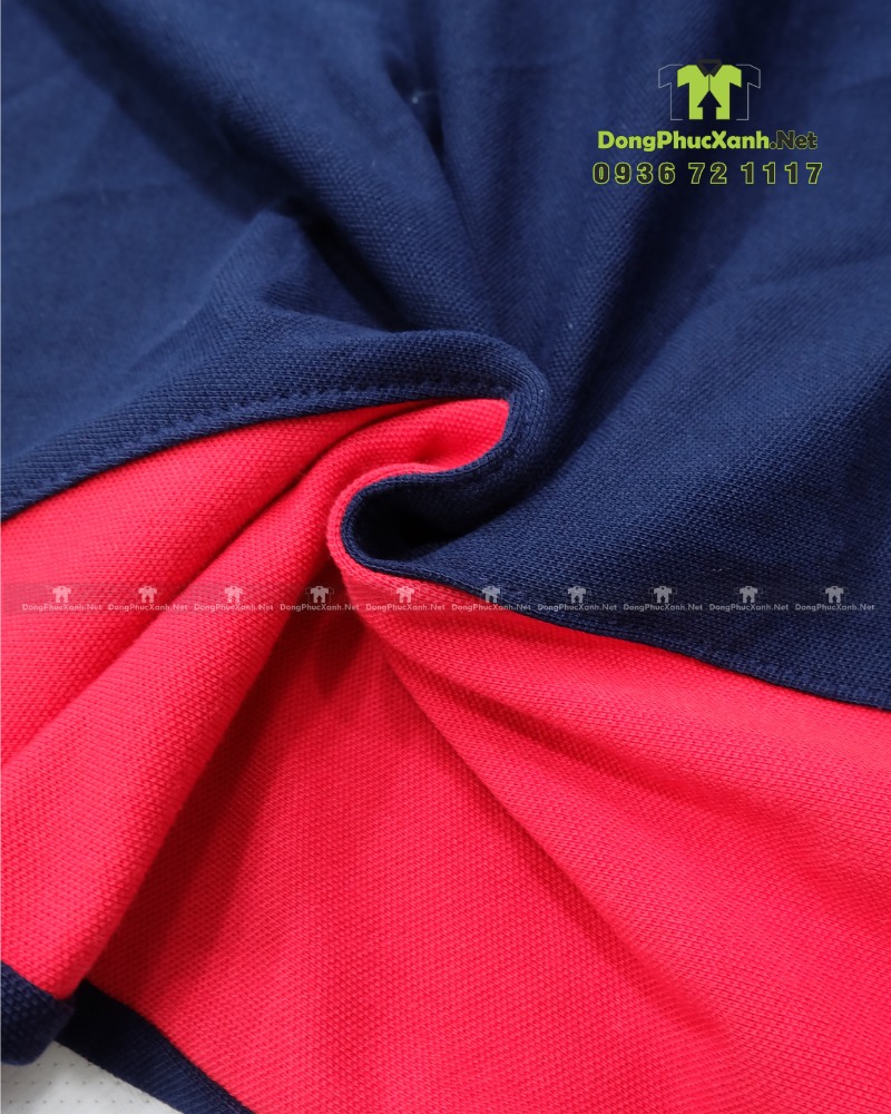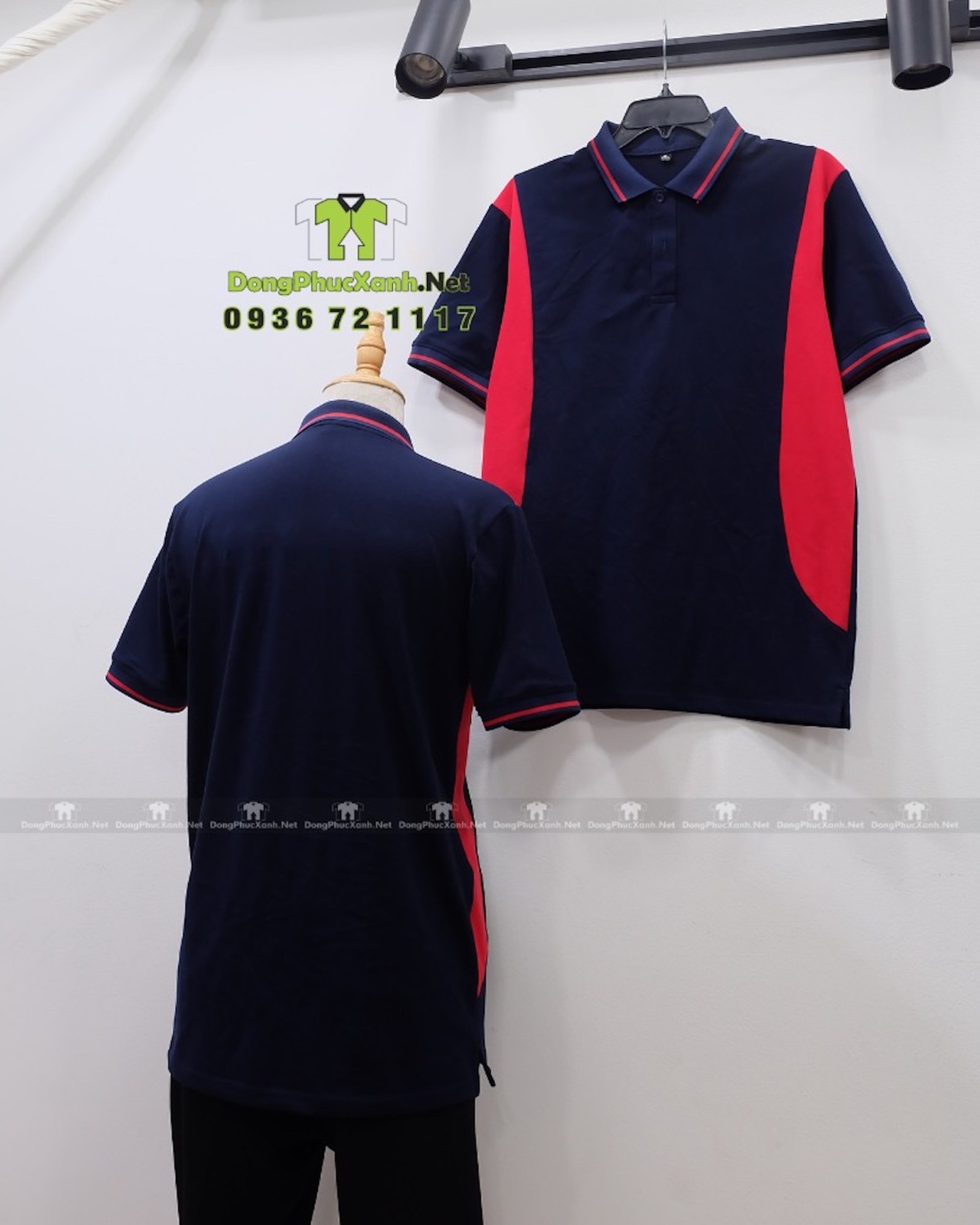 Mẫu áo sử dụng tone xanh navy phối đỏ nổi bật, thể hiện phong cách hiện đại và năng lượng tích cực.