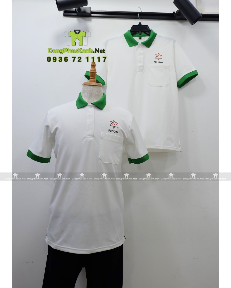 Sản phẩm sử dụng màu trắng chủ đạo kết hợp viền xanh ở cổ và tay áo, mang lại cảm giác thanh lịch, hiện đại và dễ nhận diện thương hiệu.