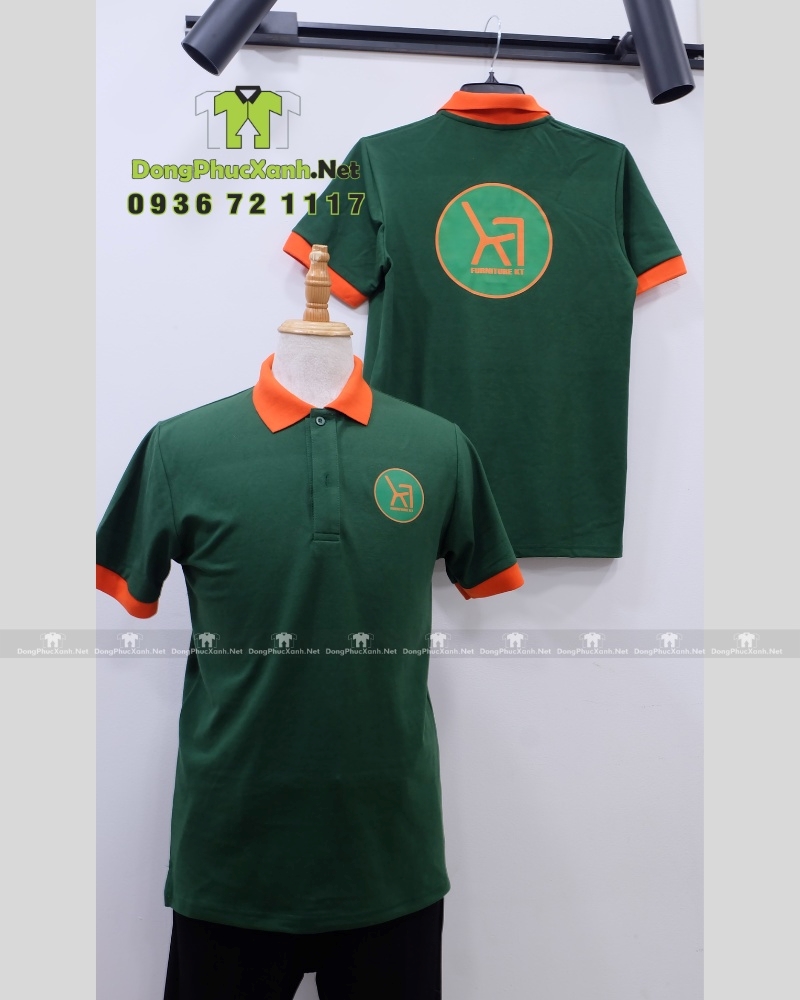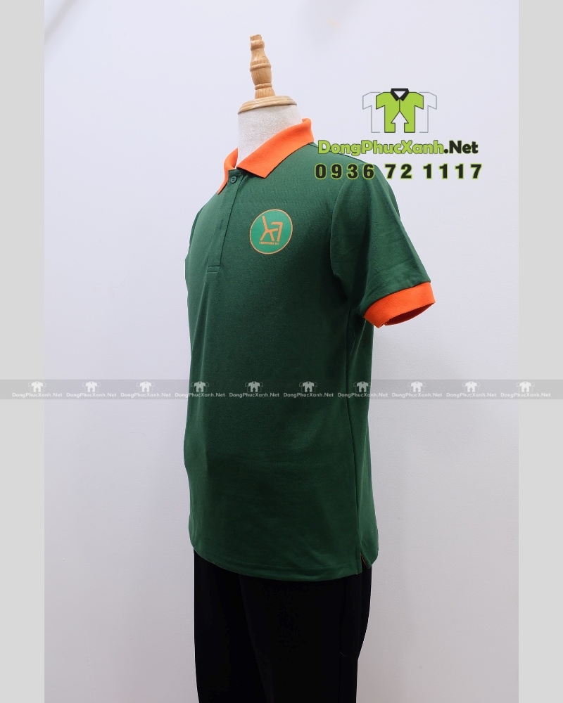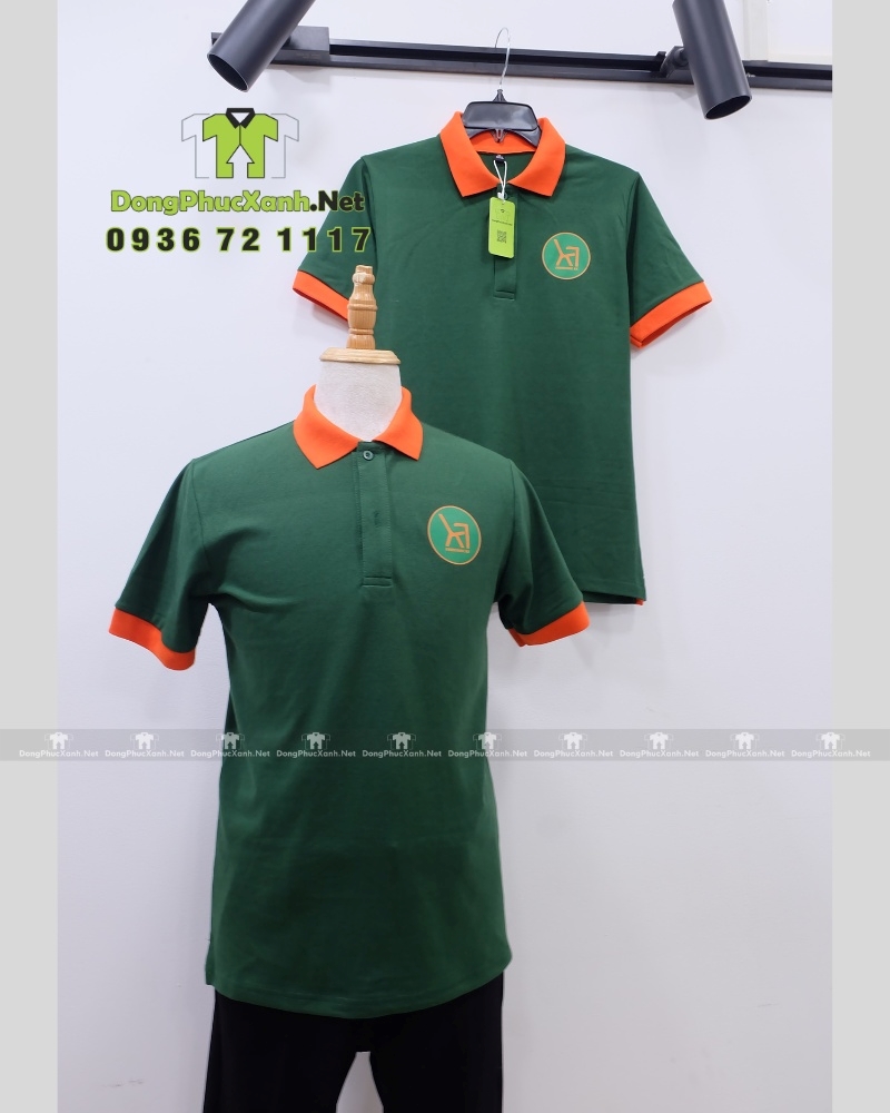 Mẫu áo nổi bật với tông xanh lá phối cổ và tay cam, logo in cam nổi bật, mang đến sự trẻ trung, hiện đại và khác biệt.
