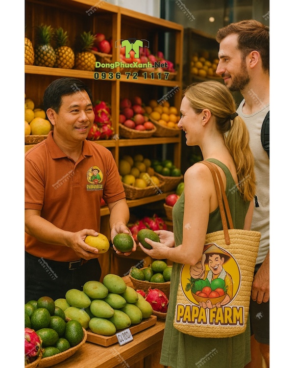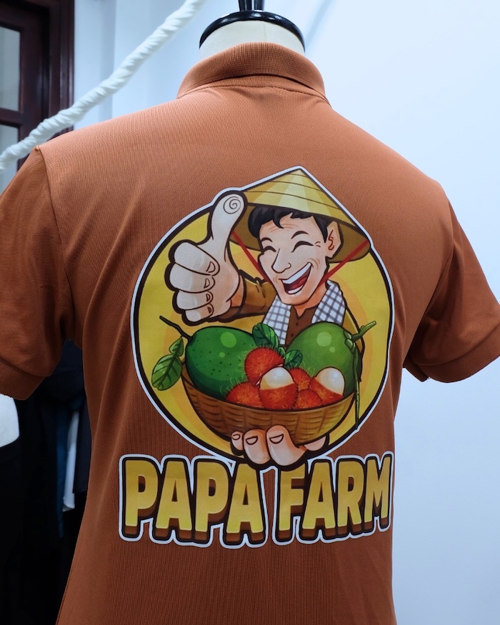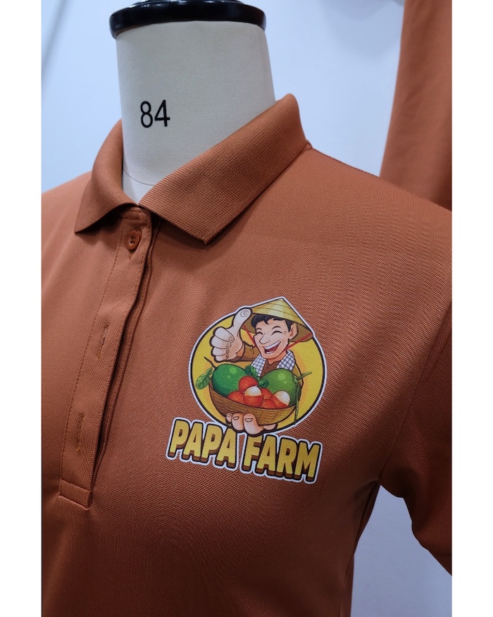 Kiểu áo polo cổ bẻ tinh tế, phối cùng logo Papa Farm in lớn phía sau lưng, giúp tăng khả năng nhận diện thương hiệu và tạo sự đồng bộ chuyên nghiệp cho đội ngũ nhân viên.