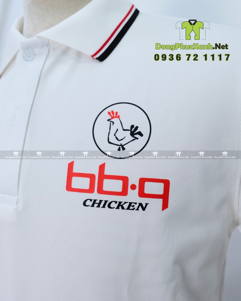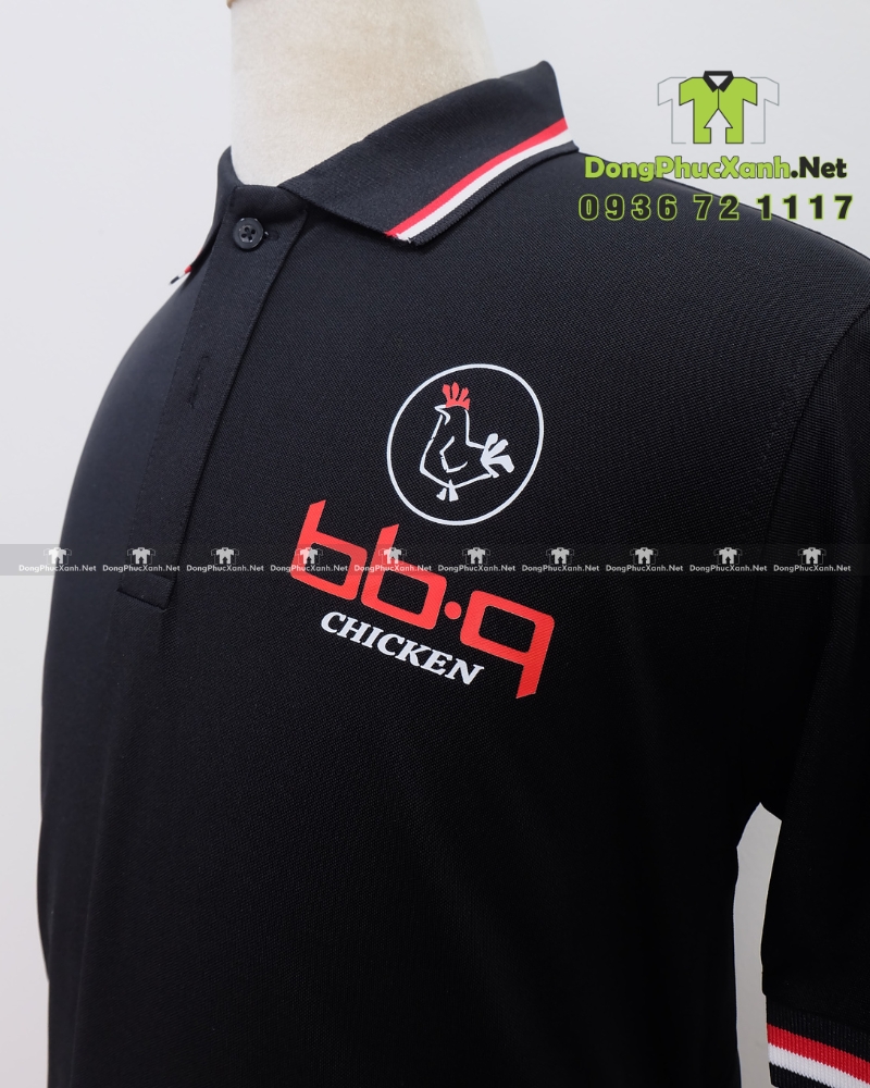 - Áo polo được thiết kế cổ bẻ tạo sự chỉnh chu, phần viền cổ và viền tay phối sọc đen đỏ đen. Trên ngực trái áo có logo hình gà trong vòng tròn kèm chữ bb.q và chữ CHICKEN tạo nhận diện rõ mà không làm áo bị rối bố cục.