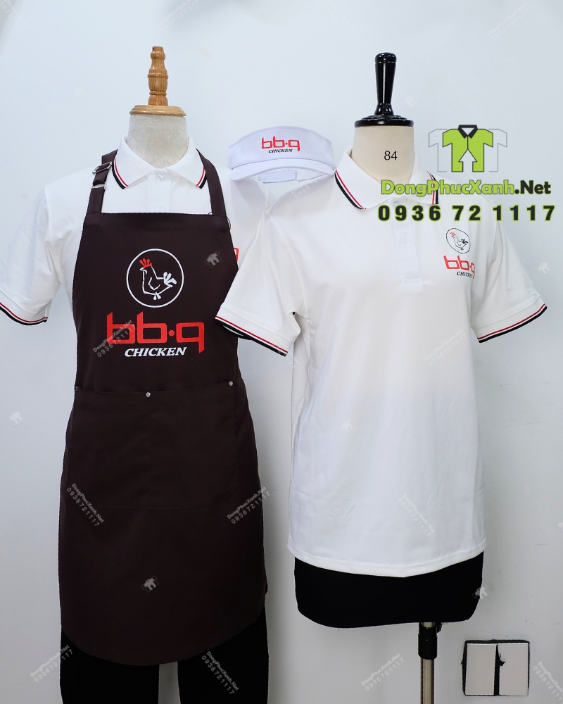 Set phối trắng và nâu đậm giúp cân bằng giữa cảm giác sạch sẽ và khả năng che bẩn, phù hợp quán nướng nơi dễ dính dầu, sốt và khói bếp. Logo trên tạp dề là chữ bb.q màu đỏ và chữ CHICKEN màu trắng tạo sự tương phản mạnh. Logo trên áo được thu nhỏ ở ngực trái để phù hợp phục vụ bàn, trong khi logo lớn trên tạp dề tạo hiệu quả nhận diện ngay khi nhân viên quay ngang, cúi người hoặc thao tác ở quầy.