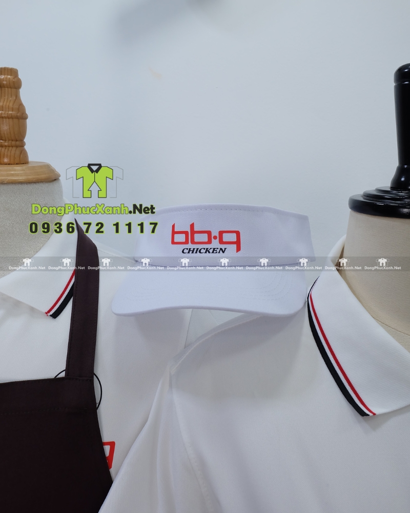 Nón visor màu trắng giúp hoàn thiện sự đồng bộ và tăng tính chuyên nghiệp khi nhân viên đứng phục vụ ngoài sảnh. Trên nón có chữ bb.q màu đỏ và chữ CHICKEN màu đen, phù hợp môi trường quán ăn vì tạo điểm nhận diện mà không gây rối khi phối cùng áo trắng và tạp dề nâu. Việc dùng nón đồng phục cũng hỗ trợ giữ tóc gọn gàng, tạo cảm giác chỉn chu trong mắt khách khi tiếp xúc trực tiếp.