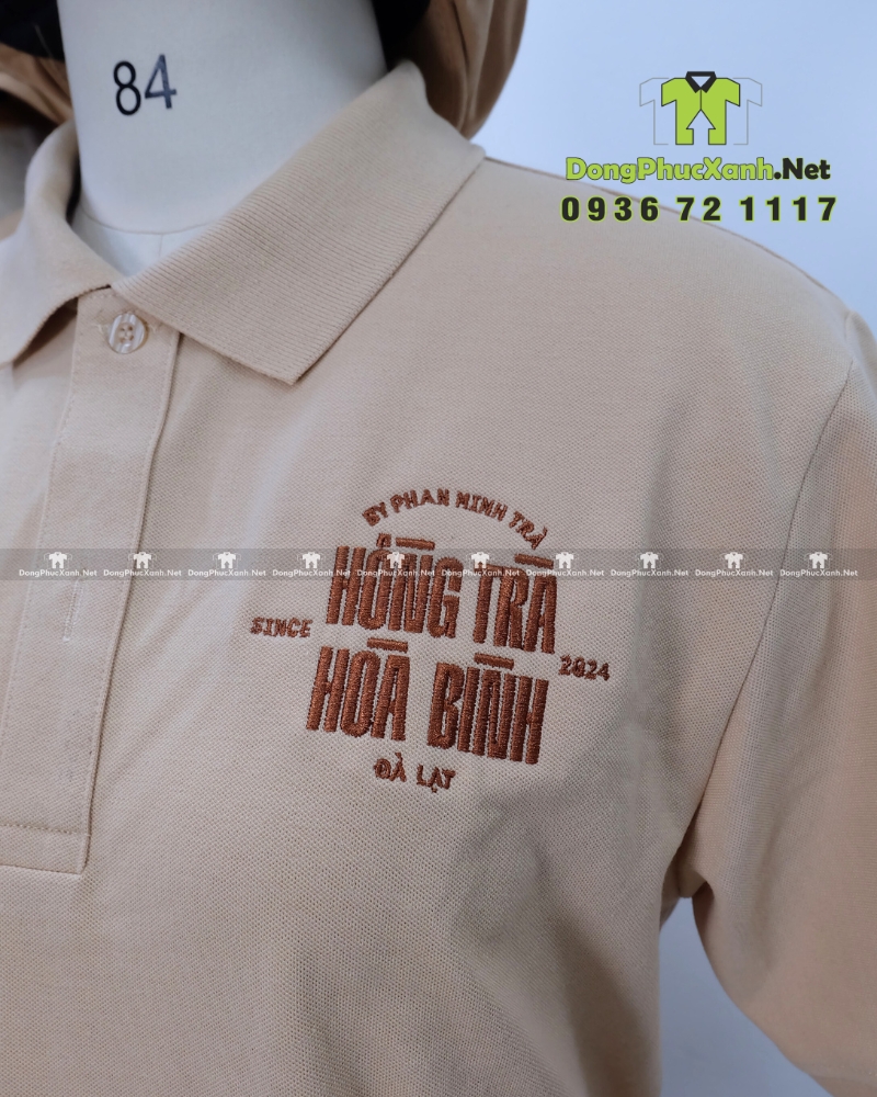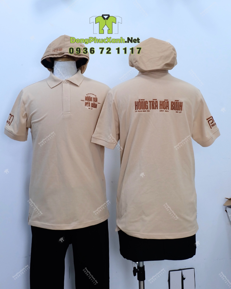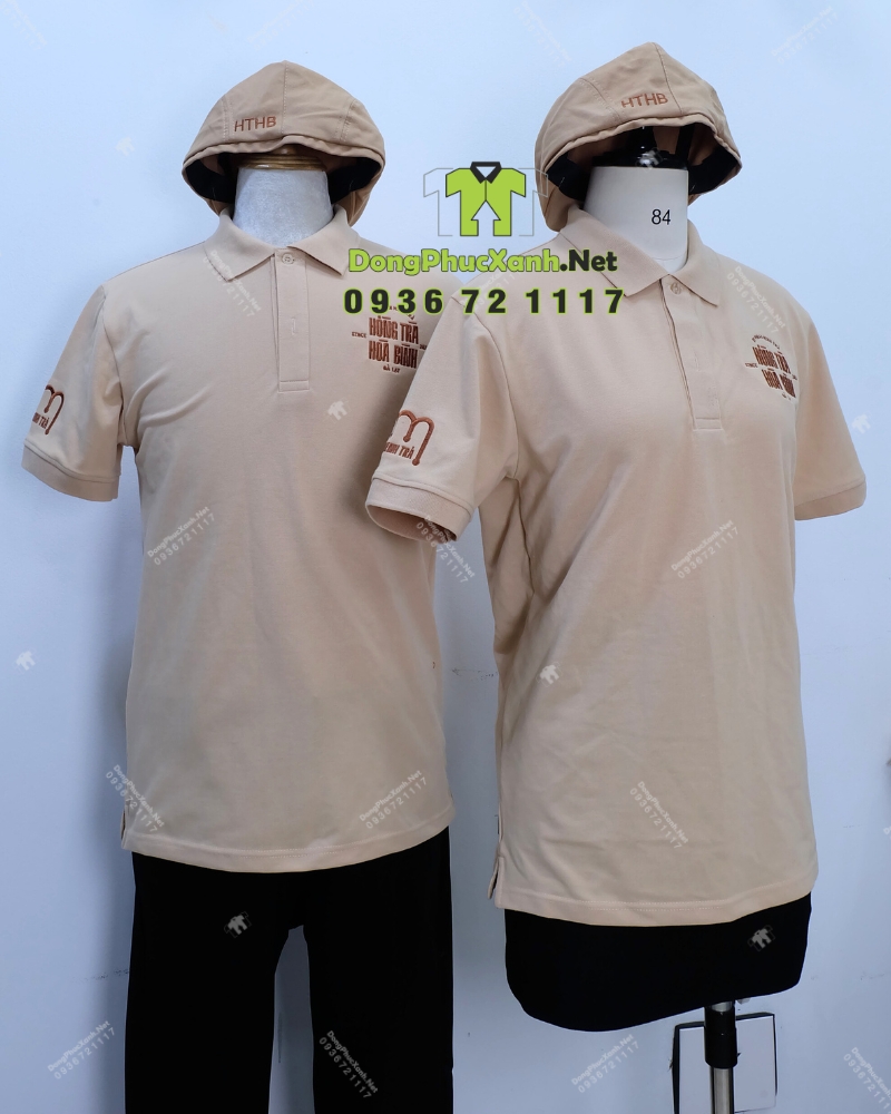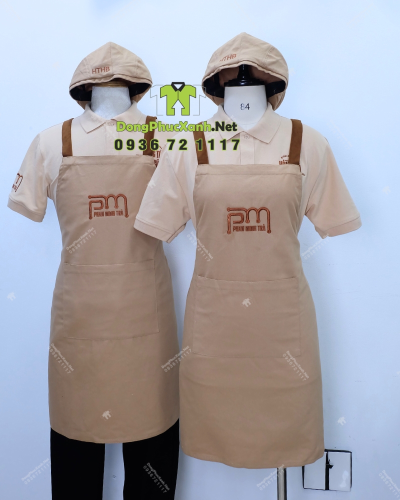 Tông be và nâu mang lại cảm giác dịu mắt và sạch, phù hợp với phong cách thiên nhiên thường thấy ở quán cà phê và tiệm trà. Nếu thương hiệu cần màu riêng theo logo Dongphucxanh.net có thể điều chỉnh màu áo, màu dây tạp dề và màu nón để đồng phục hòa vào tổng thể không gian, đồng thời vẫn giữ điểm nhấn nhận diện ở phần thêu logo.