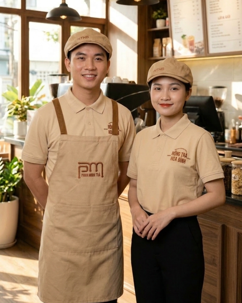 Áo polo mang lại vẻ lịch sự, linh hoạt khi đứng quầy hay di chuyển phục vụ. Tạp dề yếm giúp hạn chế bám bẩn, giữ áo bên trong luôn sạch sẽ, đồng thời túi lớn hỗ trợ thao tác nhanh trong giờ cao điểm. Nón đồng phục giúp tóc gọn gàng, tăng cảm giác vệ sinh và sự chỉn chu tại khu pha chế, đặc biệt phù hợp với các mô hình đồ uống chú trọng hình ảnh phục vụ.