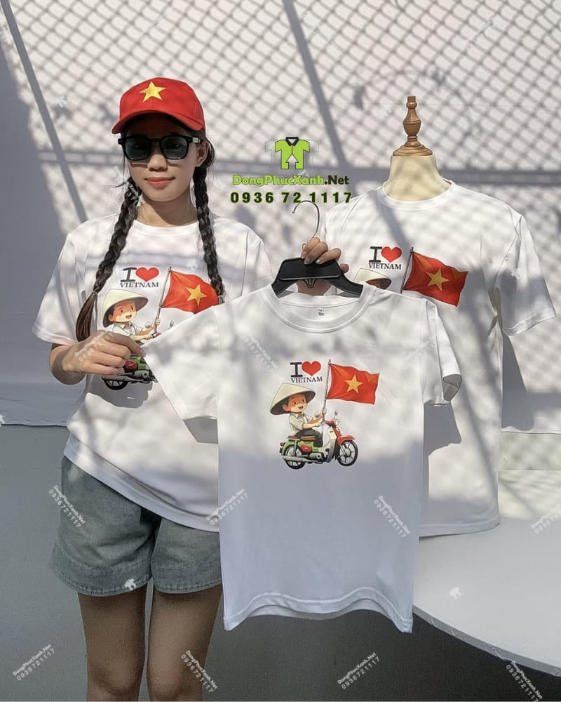 DongPhucXanh.Net là xưởng may đồng phục uy tín, chuyên thiết kế và sản xuất các mẫu áo thun sự kiện, áo thun quà tặng đậm chất Việt Nam. Mẫu áo “I Love Vietnam” với hình ảnh minh họa sinh động là lựa chọn hoàn hảo cho các gia đình, nhóm bạn trẻ hoặc làm quà tặng cho khách quốc tế, giúp lan tỏa hình ảnh đất nước một cách gần gũi và hiện đại.