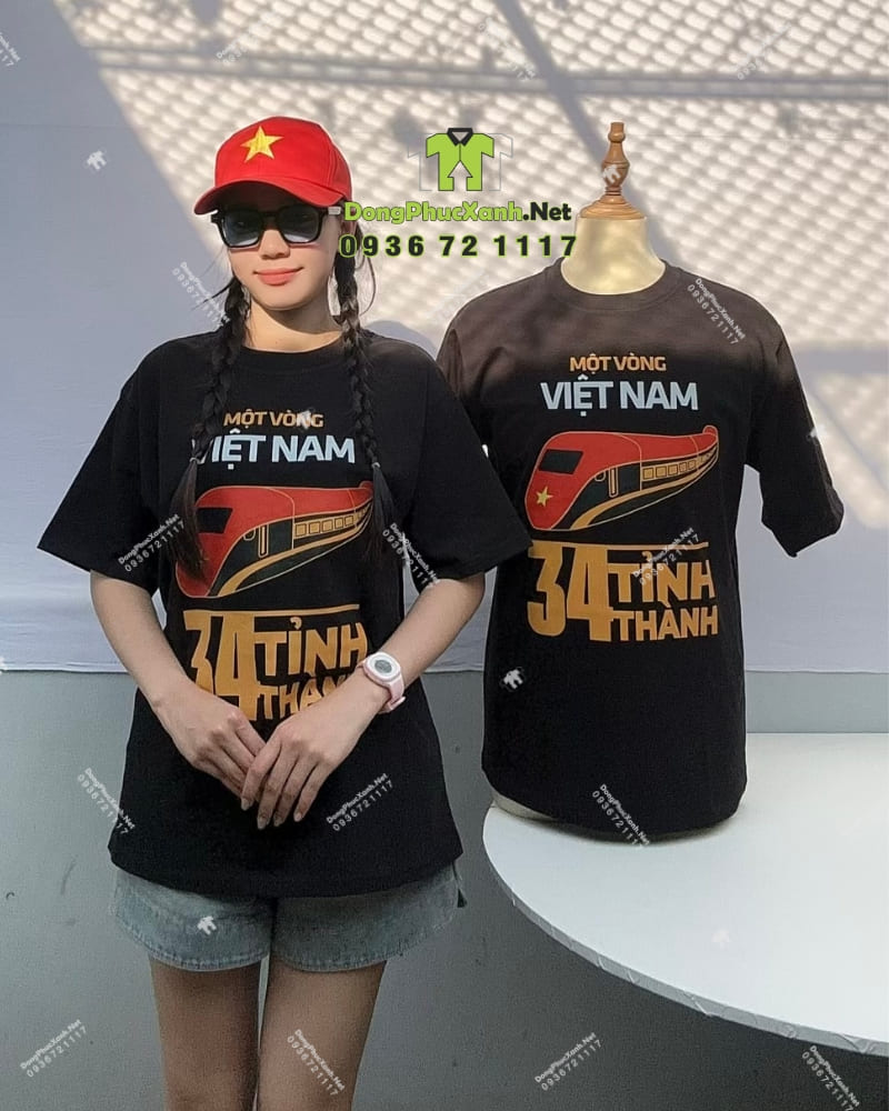 Mẫu áo thun trong hình sở hữu thiết kế vô cùng ấn tượng với thông điệp “Một Vòng Việt Nam”. Điểm nhấn trung tâm là hình ảnh con tàu cao tốc hiện đại với tông màu đỏ – vàng chủ đạo, tượng trưng cho sự kết nối bền chặt và tốc độ phát triển của đất nước.