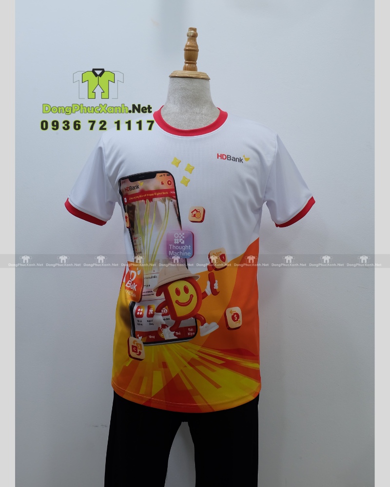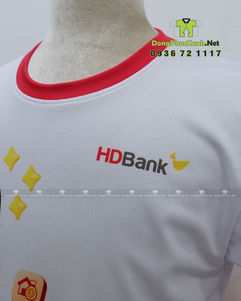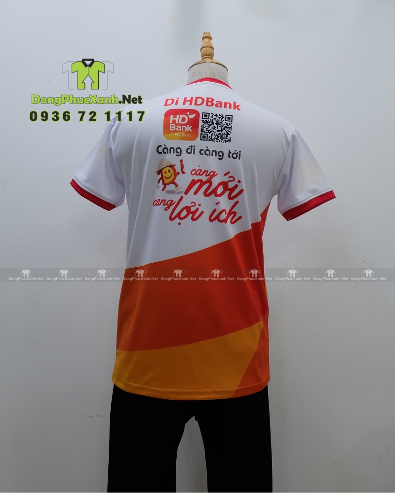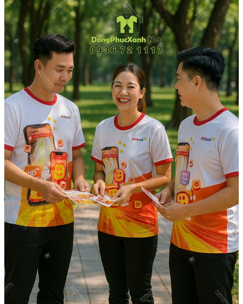 Áo sử dụng phối màu đặc trưng của HD Bank: trắng – cam – đỏ kết hợp cùng hình in chuyển sắc nổi bật. Gam màu mang tính thương hiệu mạnh, dễ nhận diện và phù hợp với các hoạt động marketing.