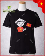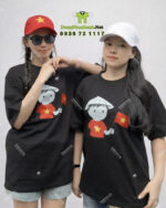 Mẫu áo thun trong hình gây ấn tượng mạnh với hình ảnh đồ họa hoạt hình (chibi) vô cùng đáng yêu: Một cô bé mặc áo đỏ sao vàng, đội chiếc nón lá truyền thống và tay cầm lá cờ Tổ quốc tung bay. Đây là sự kết hợp tuyệt vời giữa nét hiện đại, trẻ trung và giá trị tinh thần dân tộc sâu sắc.