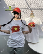 Mẫu áo thun “Tự hào Việt Nam” trong hình là sự kết hợp tinh tế giữa phong cách thời trang hiện đại và các biểu tượng văn hóa truyền thống. Áo được thiết kế kiểu cổ tròn năng động, tay ngắn, phù hợp cho nhiều đối tượng từ cá nhân đến các hội nhóm, tổ chức muốn thể hiện tinh thần dân tộc.