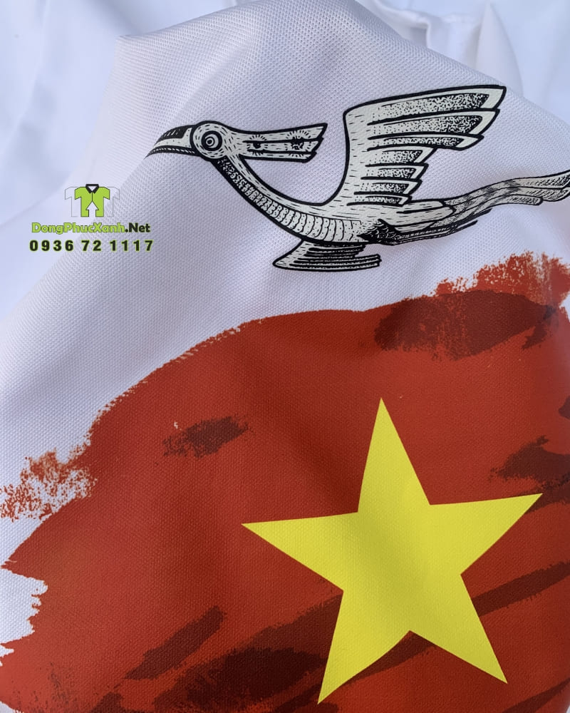 - Màu sắc in: Sự phối hợp giữa sắc vàng của ngôi sao, màu trắng của chim hạc và màu xanh dương của dòng chữ tạo nên sự tương phản nổi bật trên nền áo đỏ, đảm bảo không bị phai màu hay bong tróc khi giặt máy.