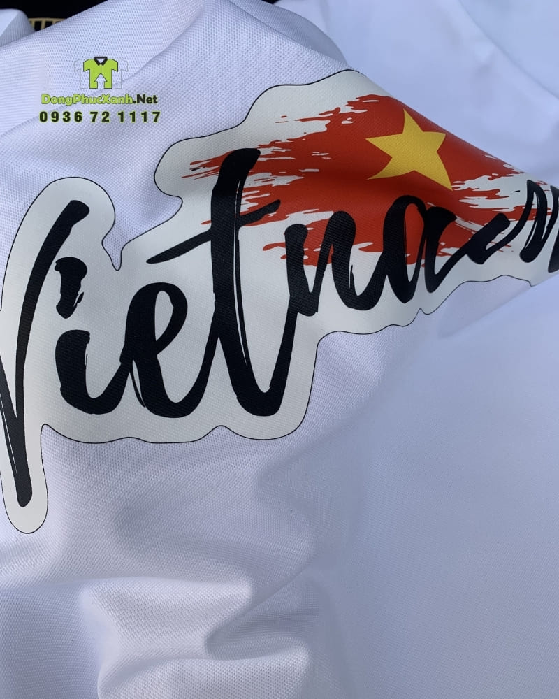 - Mực in: Sử dụng công nghệ in kỹ thuật số hoặc in lụa cao cấp, đảm bảo hình in chữ “Việt Nam” và ngôi sao vàng sắc nét, màu sắc tươi sáng, không bị bong tróc hay nứt vỡ khi co giãn vải.