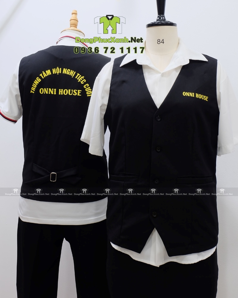 Chi tiết sản xuất Mẫu áo vest gile màu đen cho nhân viên phục vụ in logo Onni House
