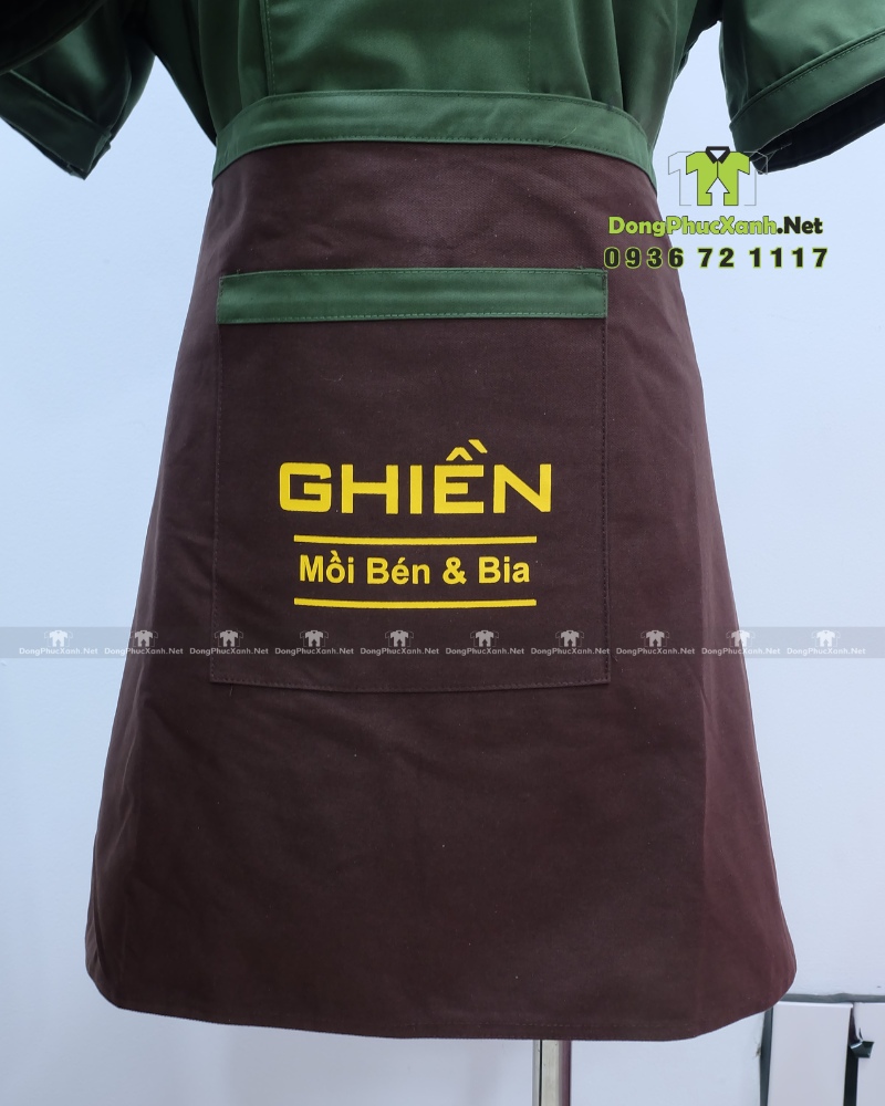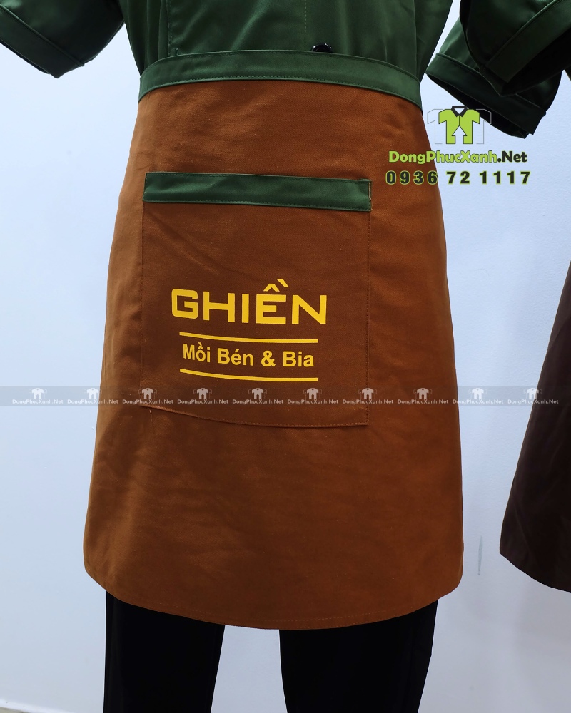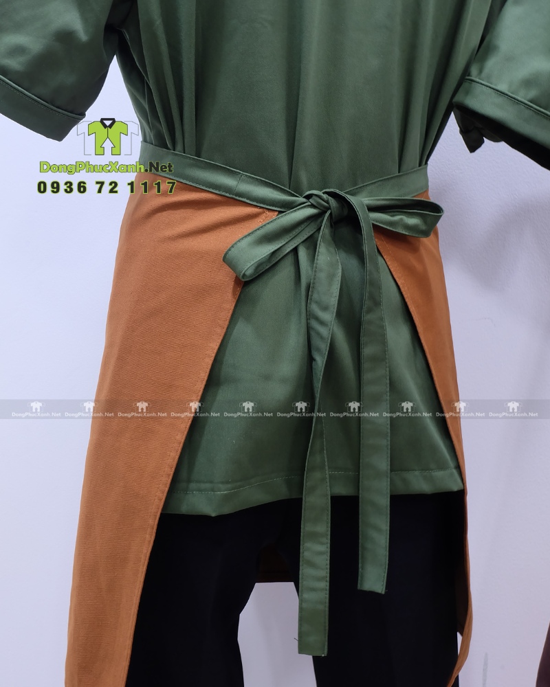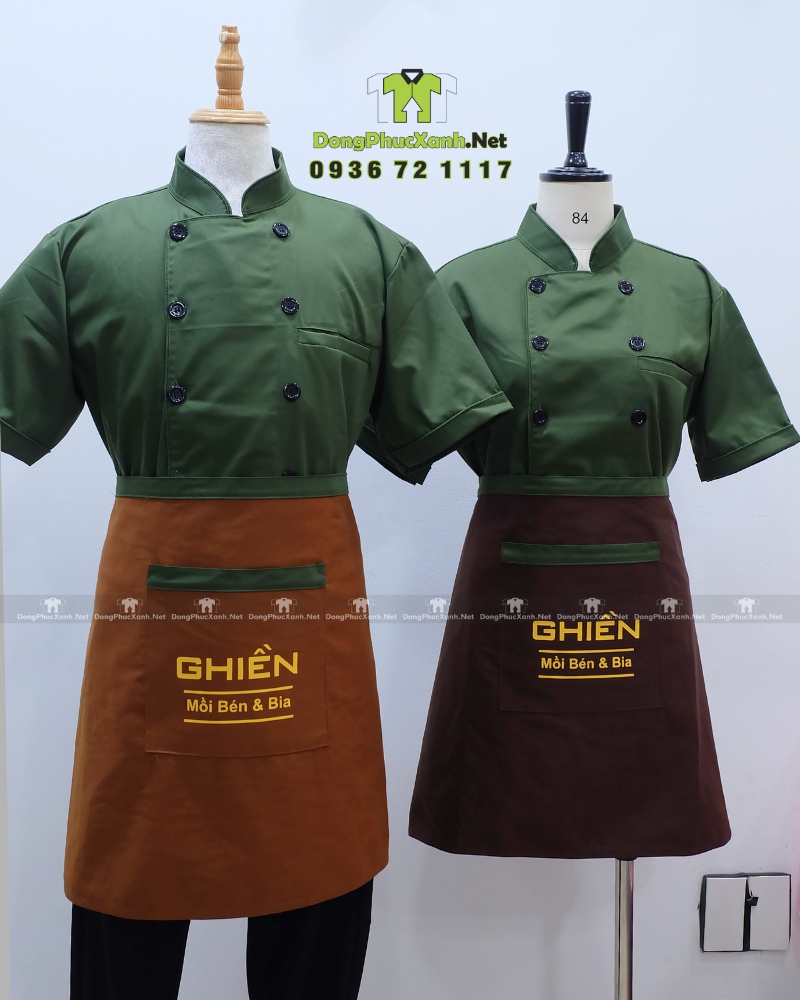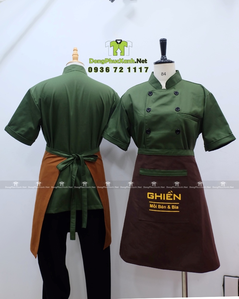 Đồng phục bếp sử dụng áo xanh lá phối tạp dề nâu sang trọng, mang đến sự hài hòa và nổi bật thương hiệu.