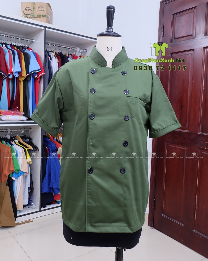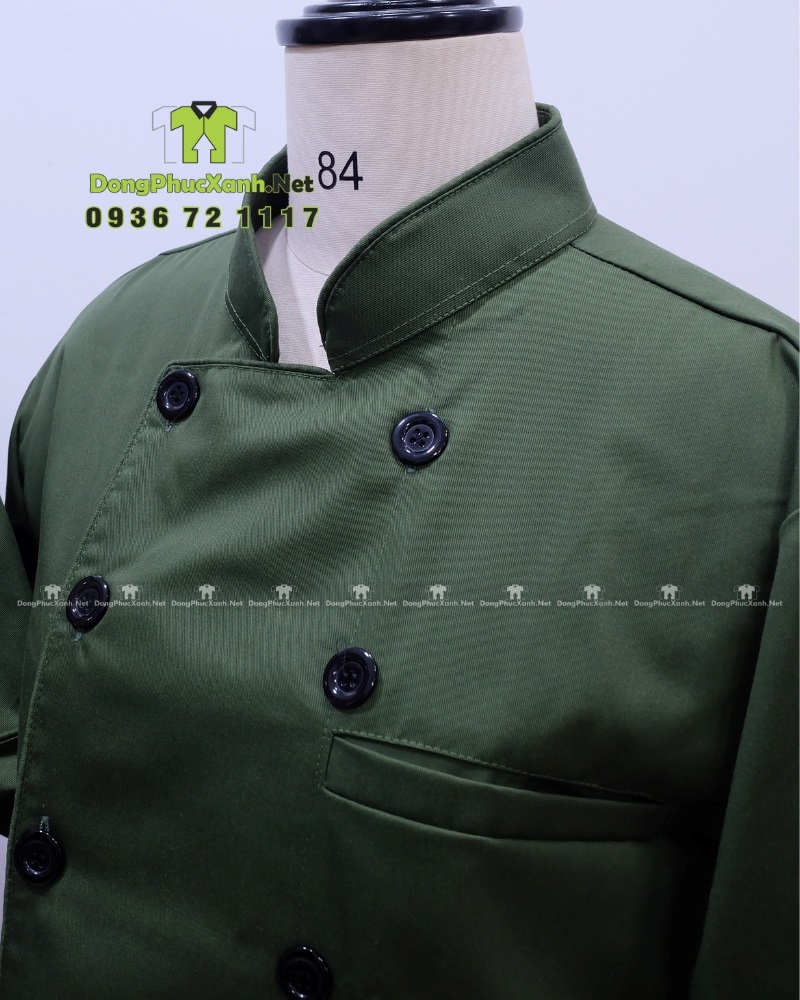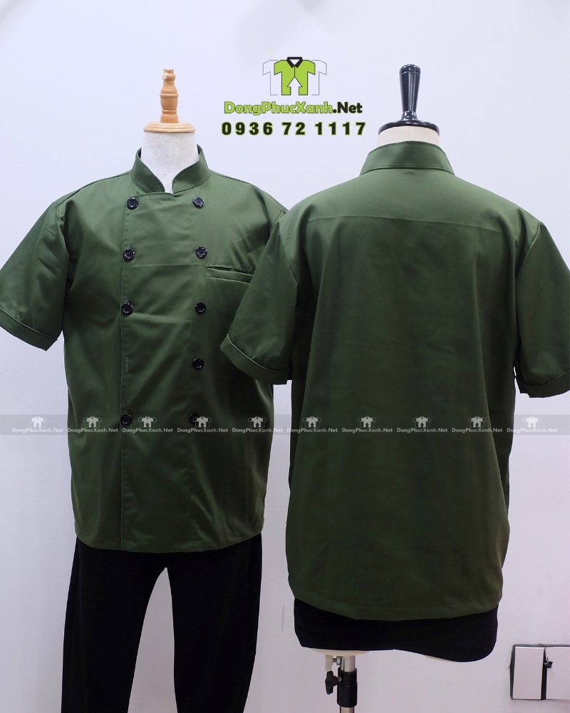 Được may bằng vải kaki 65/35, đồng phục có độ bền cao, ít nhăn và dễ giặt sạch. Vải thấm hút mồ hôi tốt, tạo sự thoải mái khi làm việc trong môi trường bếp nóng.