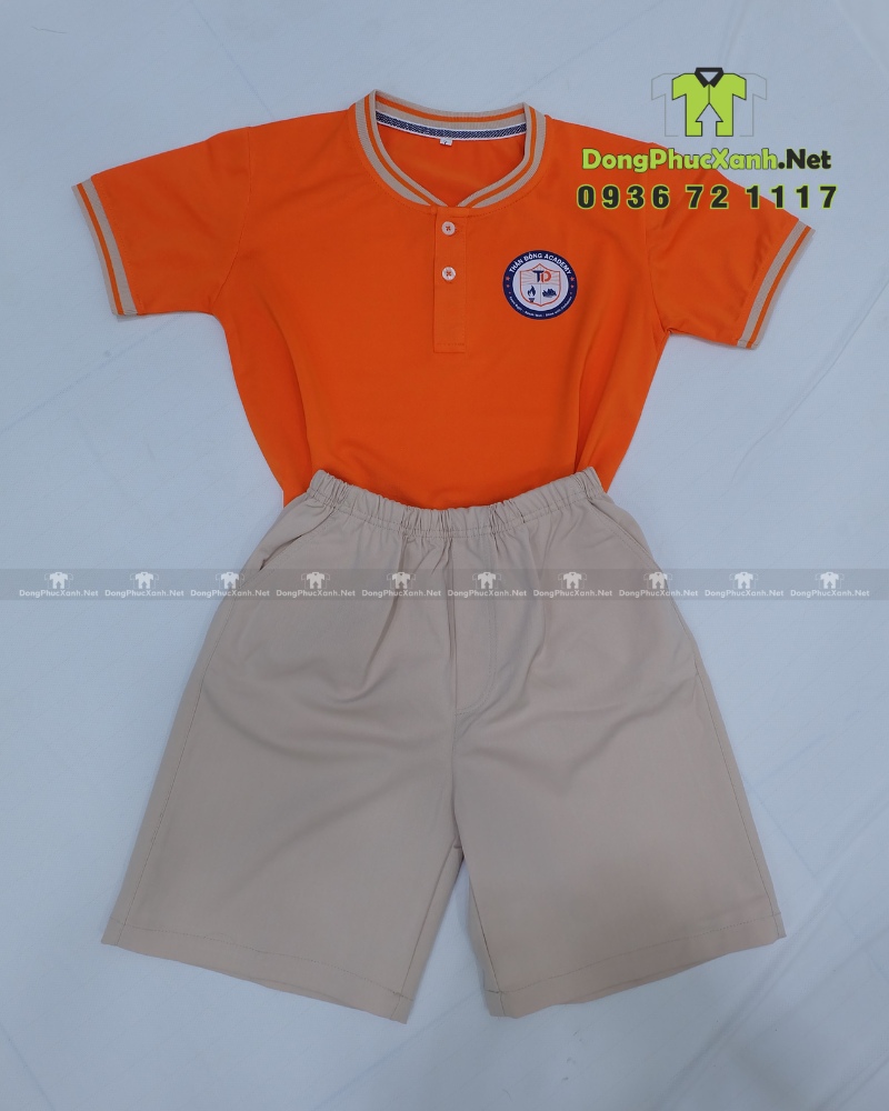 Áo cổ viền màu cam nổi bật với đường bo viền tinh tế, tạo cảm giác tươi sáng và năng động đúng tinh thần của học sinh mầm non. Thiết kể cổ trụ có nút bấm dễ mặc – tháo, phù hợp ngay cả với các bé nhỏ.