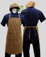 Bộ đồng phục nhân viên gồm áo thun cổ trụ, tạp dề ngắn – tạp dề dài và nón đồng phục. Thiết kế phối màu nâu – xanh đen trang nhã, tạo sự chuyên nghiệp và đồng bộ cho không gian quán.