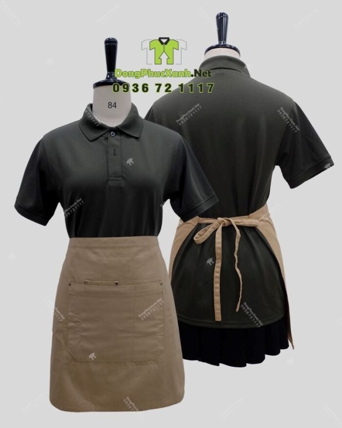 Bộ đồng phục gồm áo thun cổ trụ màu xanh rêu, có thể phối với tạp dề dài và tạp dề ngắn màu kem, màu be, màu đen, màu nâu,… đều phù hợp cho các mô hình quán cà phê, nhà hàng, bánh ngọt hoặc điểm bán take-away. Thiết kế đơn giản nhưng tinh tế, tạo phong thái gọn gàng – chuyên nghiệp cho nhân viên.