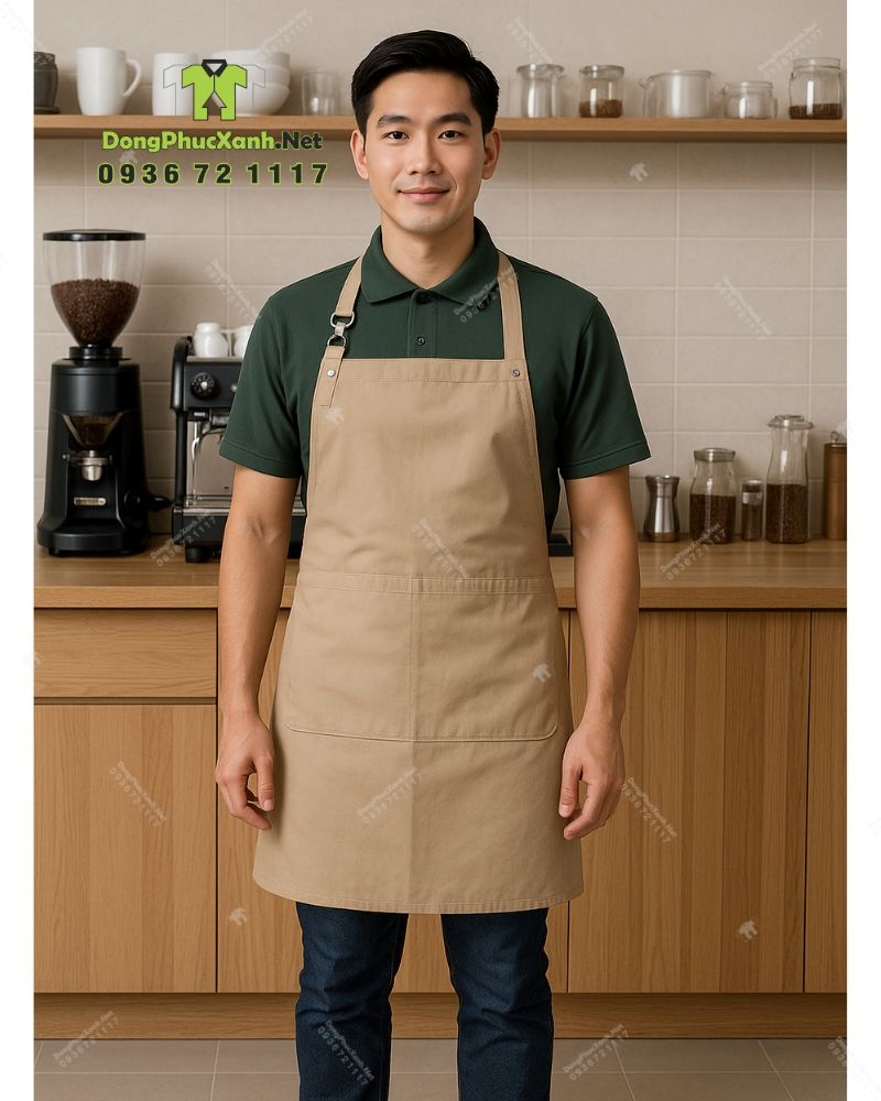 Tạp dề ngắn và dài đều may từ kaki cotton, vải dày vừa, giữ form đẹp, ít bám bẩn và dễ vệ sinh. Ngoài ra, bạn có thể lựa chọn vải kaki thun, canvas hoặc kate nếu cần thay đổi theo không gian hoặc mùa.