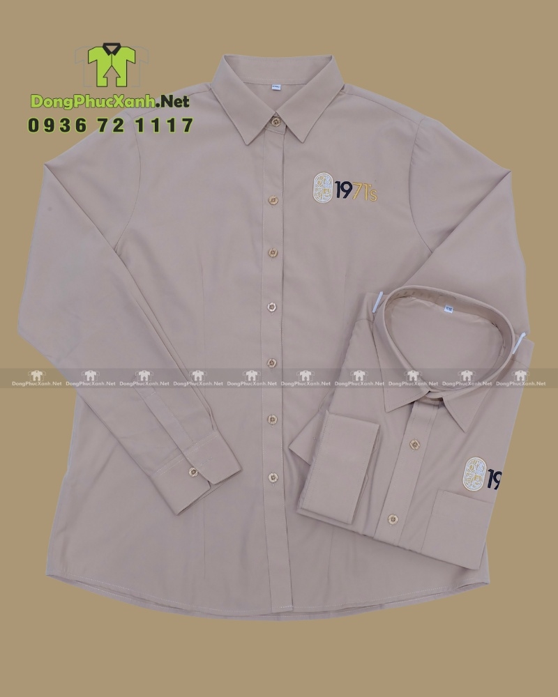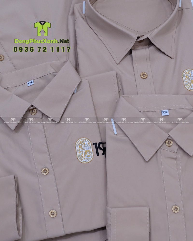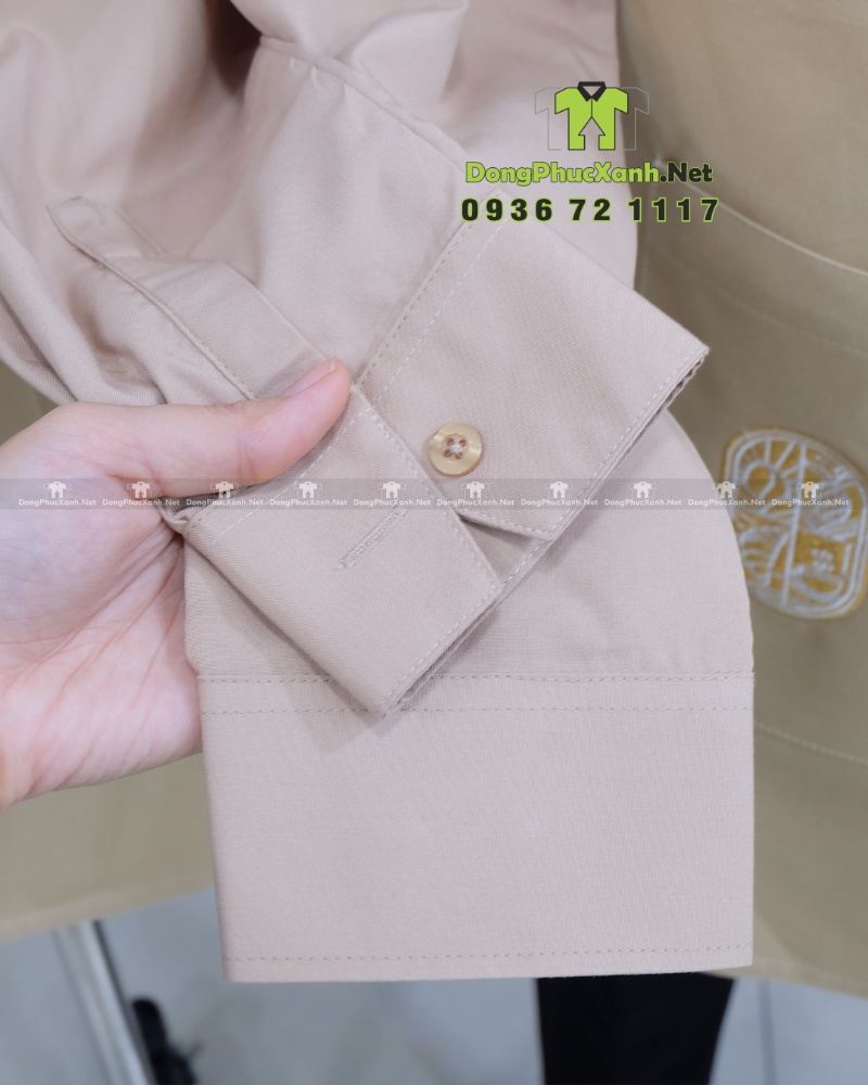 Mẫu đồng phục nổi bật với tông màu be nhã nhặn, kết hợp logo thêu vàng – đen sang trọng, tạo cảm giác tinh tế và chuyên nghiệp.