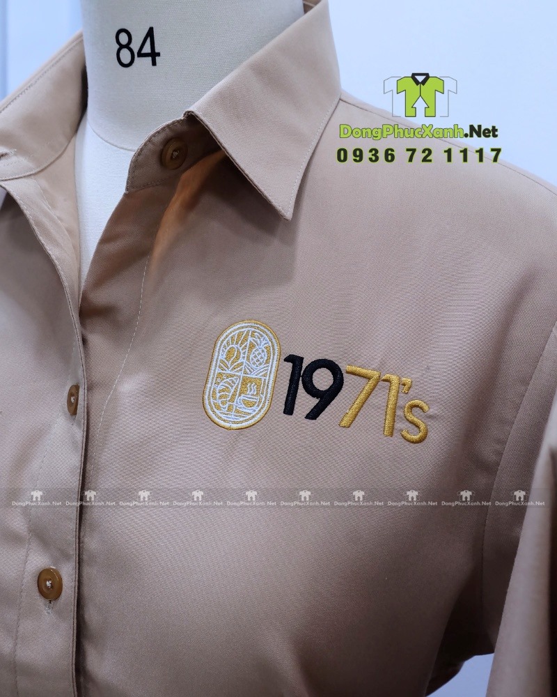 Logo 1971’s thêu sắc trên áo và tạp dề giúp tăng tính nhận diện thương hiệu, đồng thời tạo sự đồng bộ trong phong cách phục vụ.