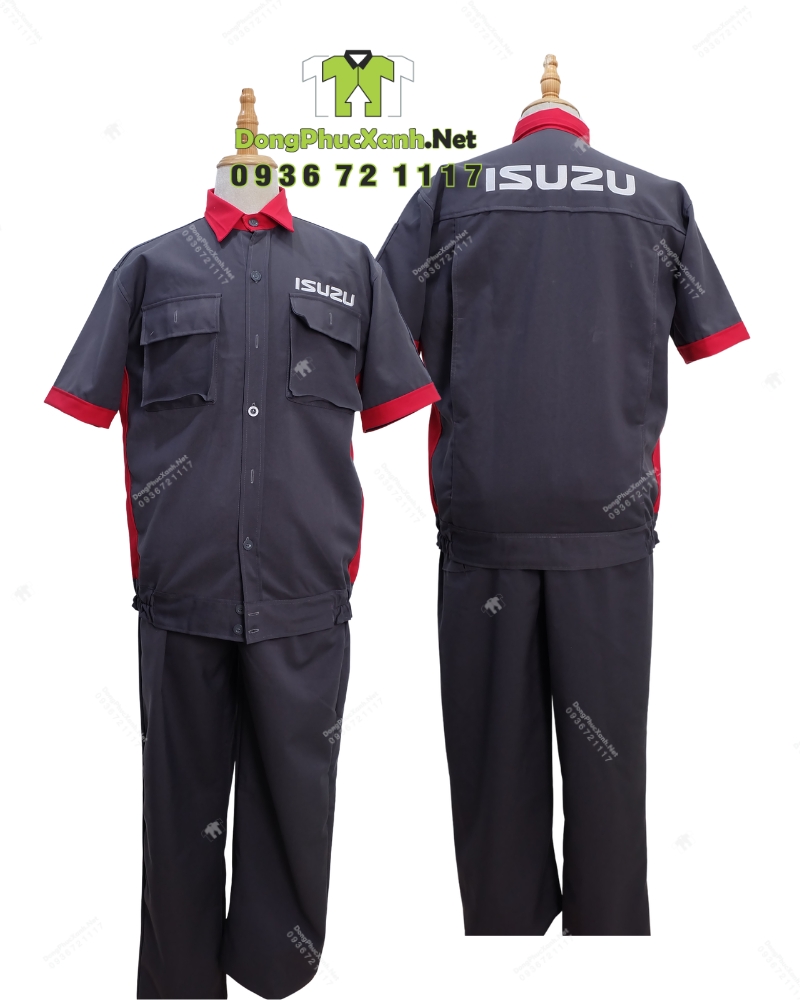 Mẫu đồng phục công nhân kỹ thuật bảo hộ lao động phối màu xám đậm và đỏ, thiết kế theo form áo bảo hộ cộc tay dạng áo sơ mi công nghiệp kết hợp quần có màu đồng bộ. Điểm nhận diện nổi bật là logo ISUZU in trắng ở ngực phải, đồng thời mặt lưng có logo ISUZU lớn giúp dễ nhận diện đội nhóm trong khu vực nhà xưởng và công trình.
