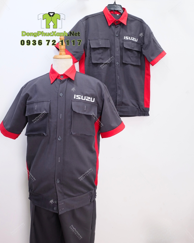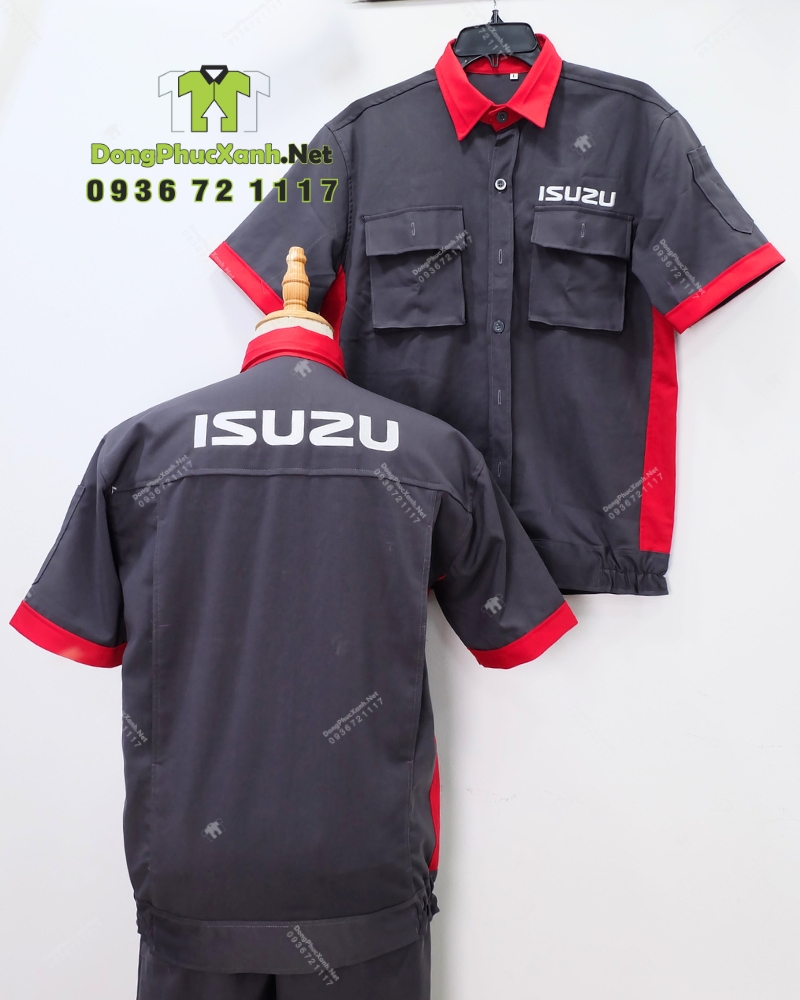 phối xám đậm và đỏ tạo tương phản rõ, giúp bộ đồ nhìn mạnh mẽ, dễ nhận diện và vẫn giữ cảm giác sạch trong môi trường làm việc thường xuyên bám bụi. Phần đỏ được đặt ở các vị trí cổ, tay và sườn nhằm tăng điểm nhấn riêng biệt. Ngoài ra, logo ISUZU cúng được in trắng ở ngực phải và in lớn ở lưng trên.