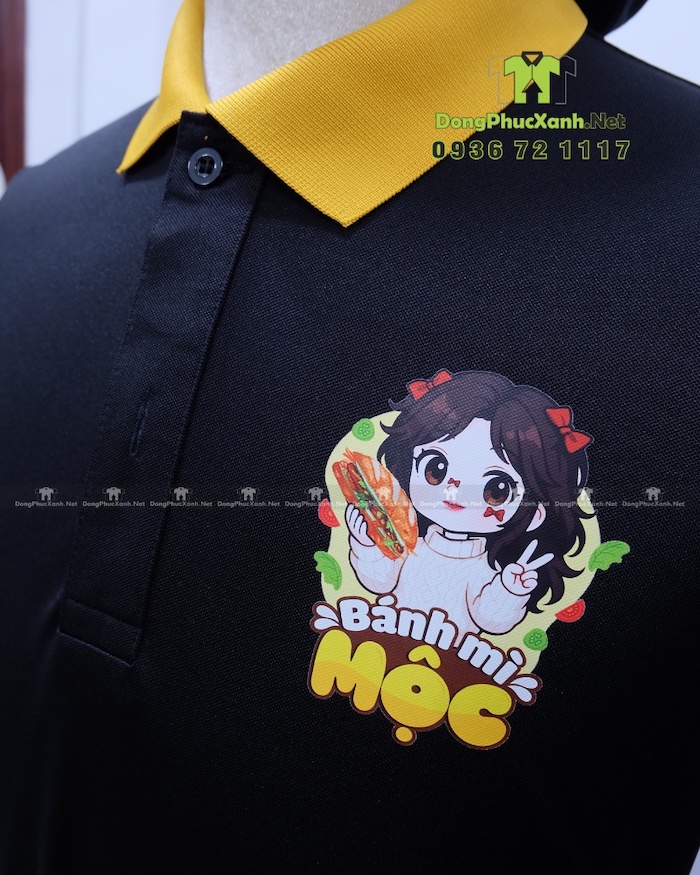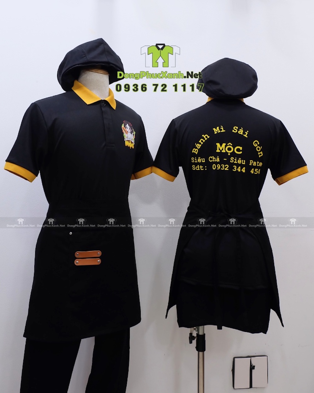 Mẫu áo đồng phục tiệm Bánh Mì Mộc mang phong cách năng động đúng chất ẩm thực đường phố Sài Gòn. Áo polo đen phối vàng nổi bật giúp nhân viên dễ nhận diện, đồng thời tạo ấn tượng sạch sẽ và chuyên nghiệp trong mắt khách hàng.