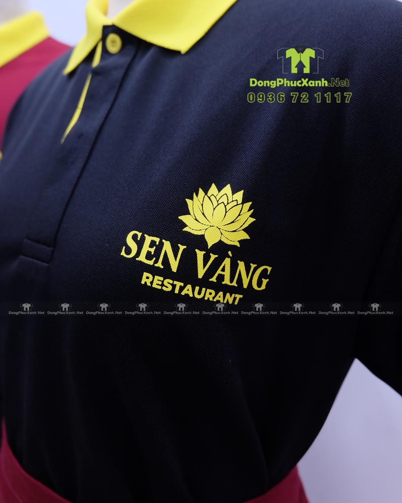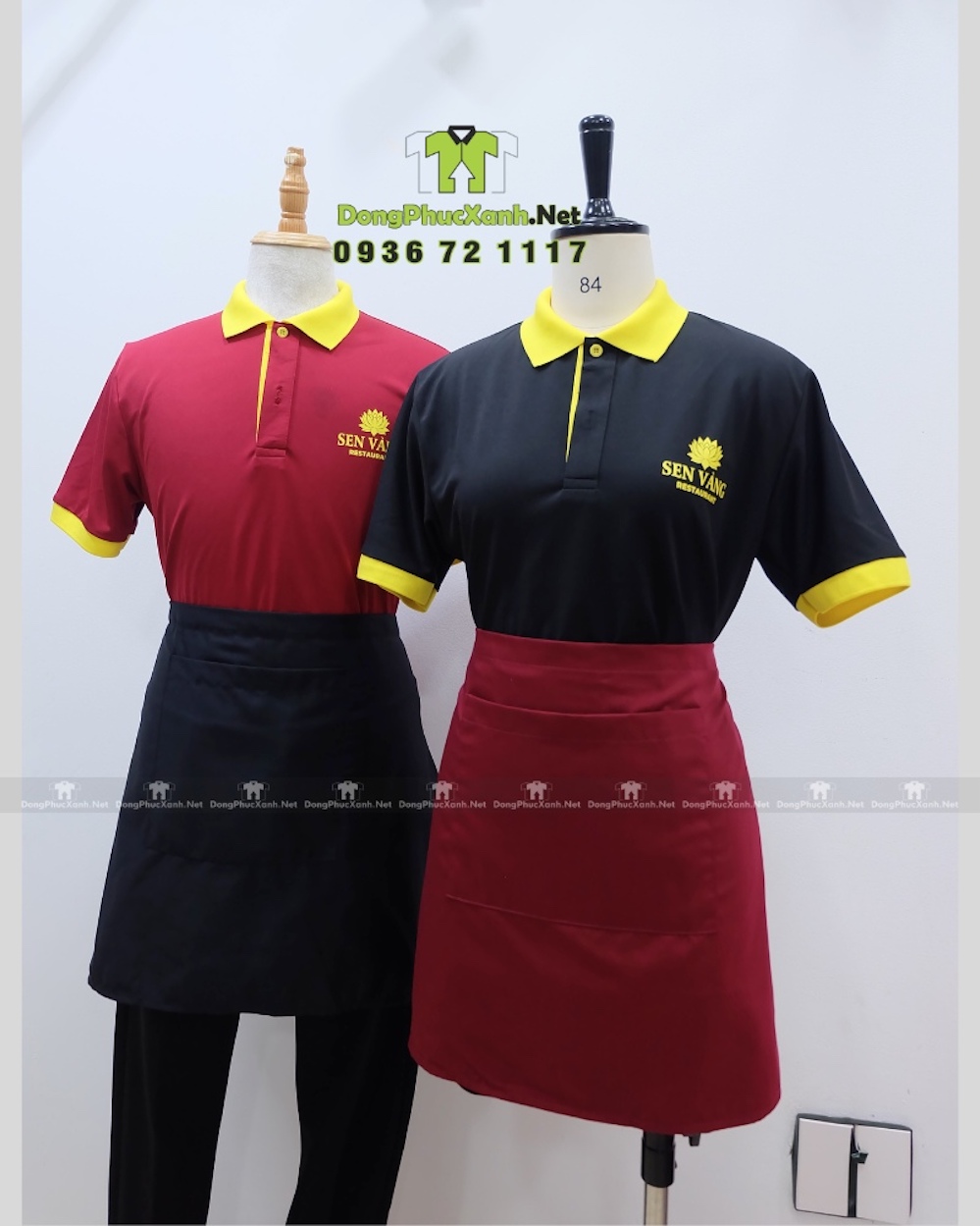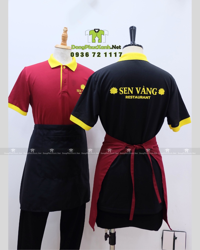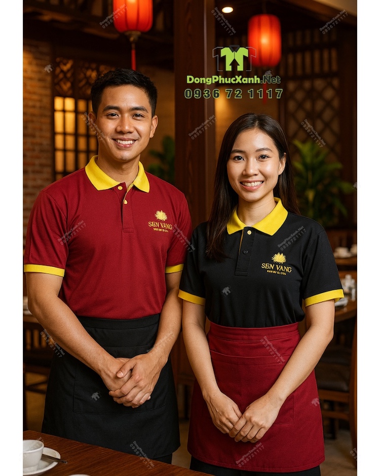 Bộ đồng phục quán ăn Sen Vàng nổi bật với hai gam màu sang trọng: đỏ đô và đen, kết hợp cổ vàng tạo điểm nhấn đầy năng lượng.