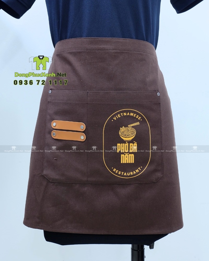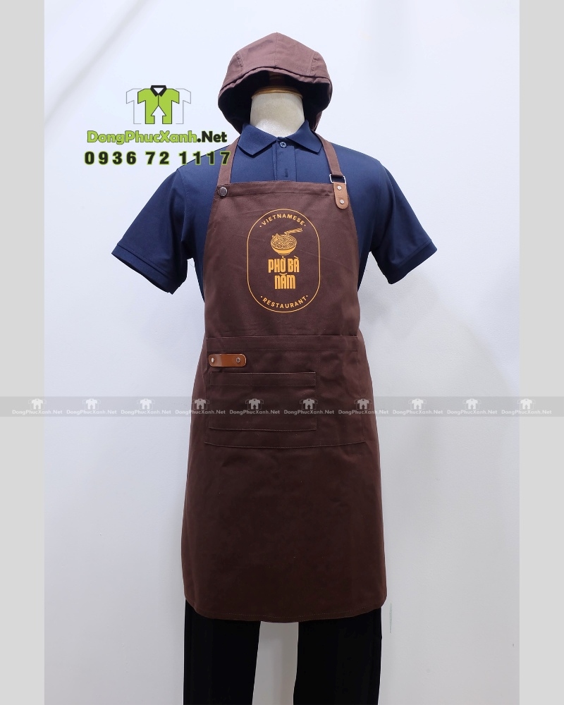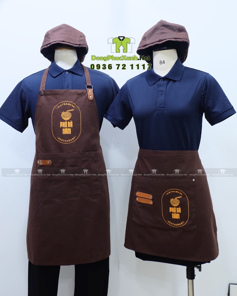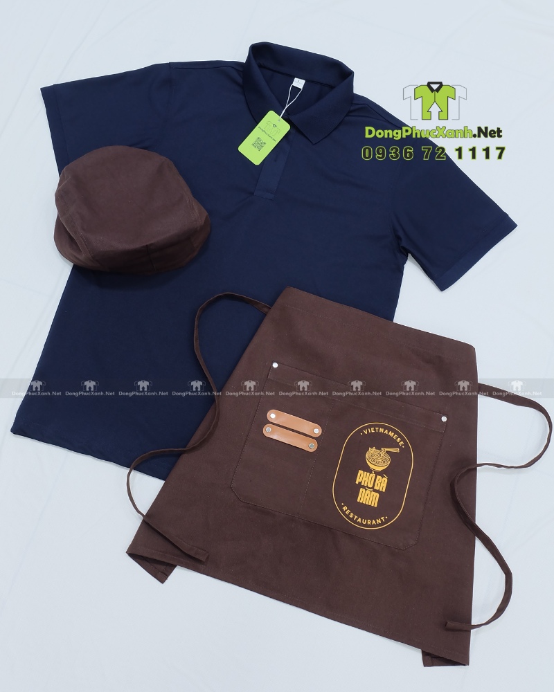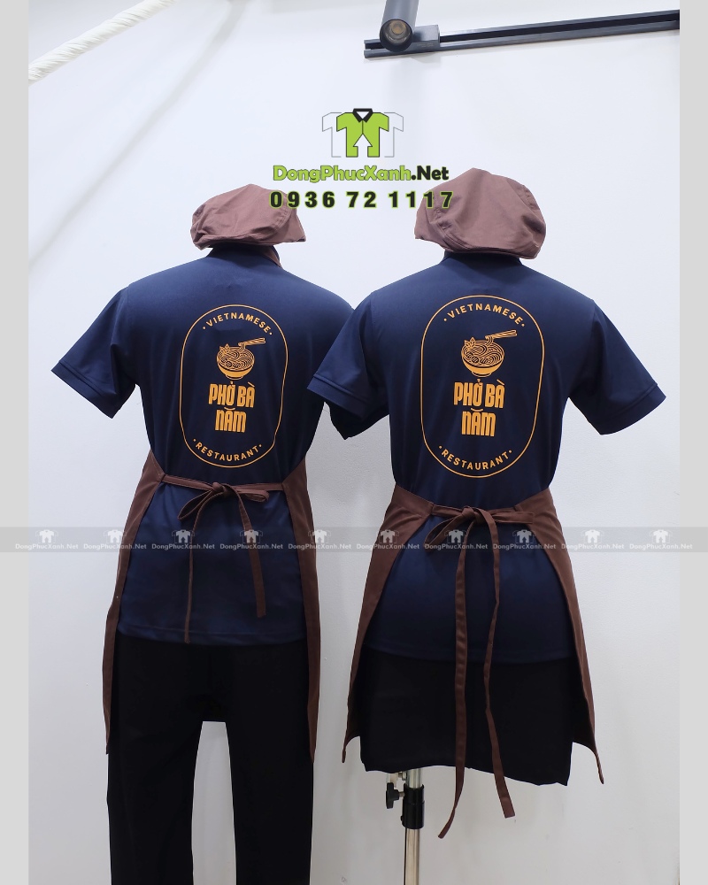 Sự kết hợp giữa áo thun xanh đen và tạp dề nâu tạo nên cảm giác ấm áp, sạch sẽ—rất phù hợp với môi trường phục vụ món Việt truyền thống.