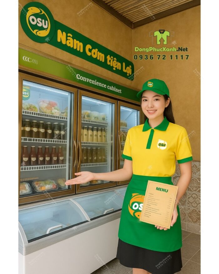 Đồng Phục Nhân Viên Phục Vụ Quán Cơm Tiện Lợi Osu – Mẫu Đồng Phục Cổ Trụ Màu Vàng Phối Xanh Lá