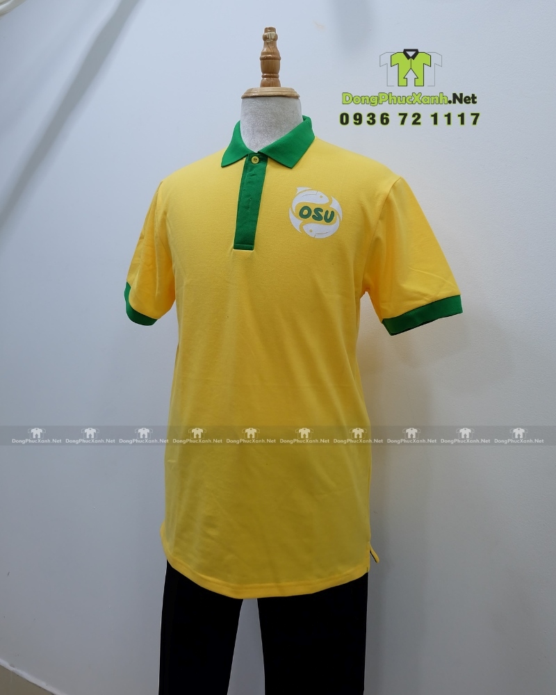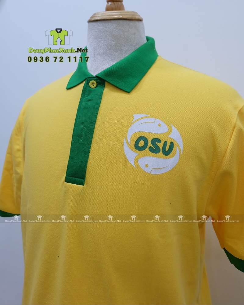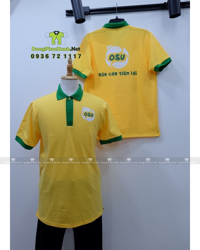 Chi tiết sản xuất Đồng phục quán ăn Osu màu vàng nổi bật, tươi mới với thiết kế áo thun cổ trun lịch sử